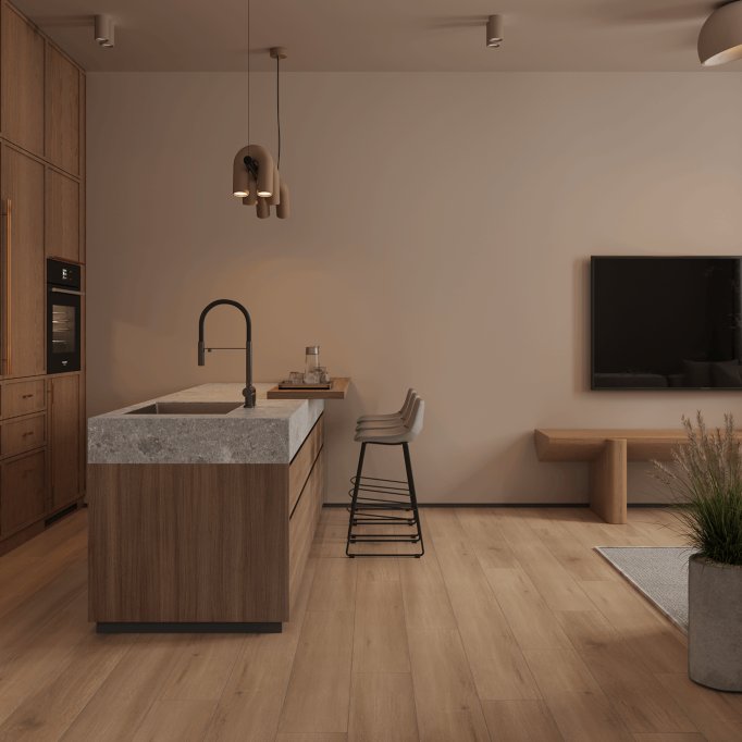Водостойкий ламинат 33 класса Aura в однополосном декоре Дуб Мантуя светло-коричневого цвета от производителя Alpine Floor толщиной 8 мм, на замковой системе Click System с 4V фаской по периметру. Синхронное тиснение в регистр с текстурой дуба. Напольное покрытие Aura Дуб Мантуя (LF100-23) продаётся упаковками по 10 планок размером 1218×196 мм общей площадью 2,3873 м².