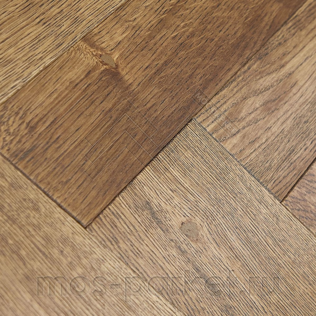 Каждая паркетная планка размером 110×600 мм в селекции Rustic отличается ярко выраженной природной структурой, с присутствием характерных для дуба особенностей — умеренных сучков, небольших трещин и вариаций цвета. Эти природные элементы создают ощущение аутентичности и делают каждый уложенный пол по-настоящему уникальным. V-образная микрофаска по периметру усиливает графичность рисунка укладки, акцентируя внимание на классической красоте английской ёлки.