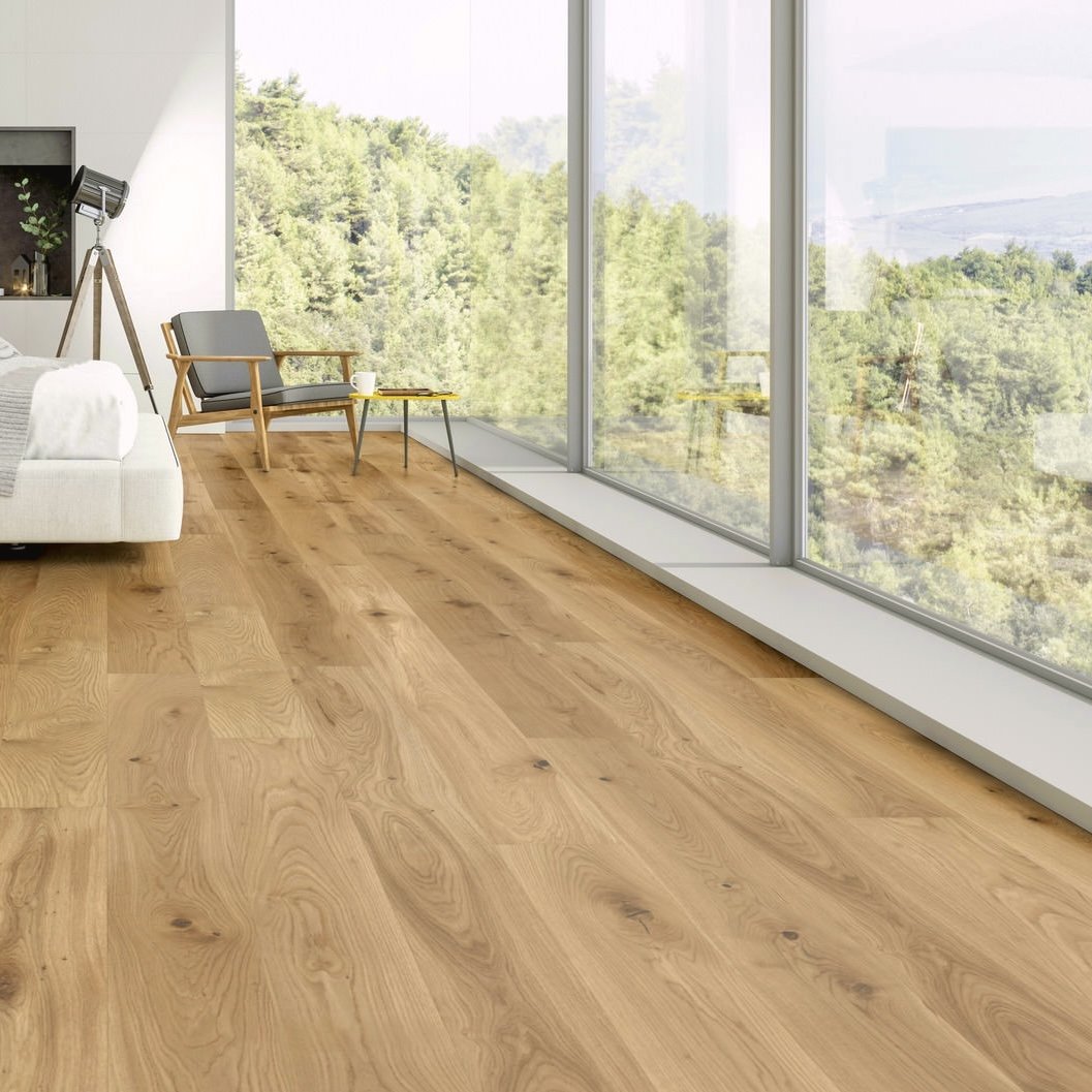 Поверхность доски покрыта маслом в три слоя, обеспечивающие надёжную защиту от повседневных нагрузок и при этом сохраняет благородную сдержанность финиша. Лёгкая текстурная поверхность подчёркивает натуральный рисунок древесных волокон, создавая тактильно приятное покрытие с выразительным рельефом. Четырёхсторонняя фаска визуально выделяет каждую планку, придавая полу завершённый вид цельного массива.