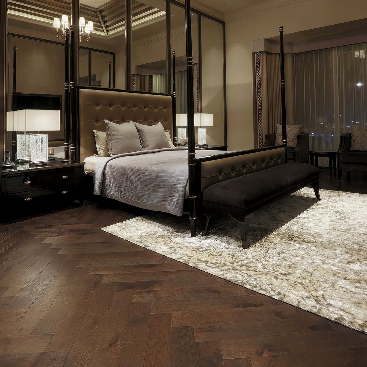 Декор «Молочный Шоколад» отличается глубоким, ровным шоколадно-кофейным оттенком. При этом селекция Таверн не позволяет поверхности выглядеть однородно: паркетины различаются по насыщенности тона, на них проступают тёмные сучки, прожилки и мягкие переходы заболони. Брашированная фактура делает рисунок тактильно объёмным. Этот паркет хорошо раскрывается в больших гостиных, кабинетах и столовых, особенно в сочетании со светлой мебелью, кожей и латунной фурнитурой.