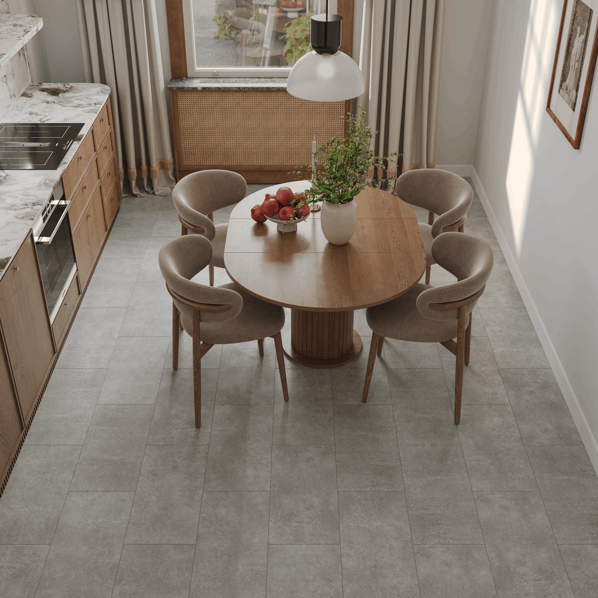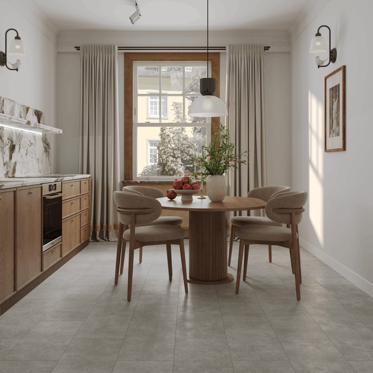 Плитка гармонично вписывается в стили минимализм, скандинавский, contemporary и современную классику. Она отлично сочетается с мебелью из натурального дерева, светлыми фасадами, текстилем в бежевых и серых оттенках, а также с чёрной или латунной фурнитурой.