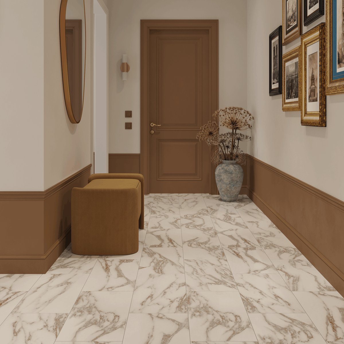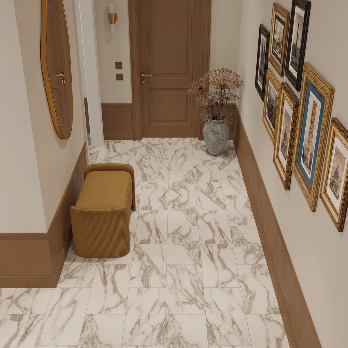 Плитка гармонично вписывается в интерьеры в стиле современная классика, арт-деко, contemporary и минимализм с акцентами. Она отлично сочетается с латунной и золотистой фурнитурой, мягкой мебелью в светлых тонах, натуральным деревом и стеклянными элементами. В коммерческих пространствах такой декор формирует премиальный и запоминающийся образ.