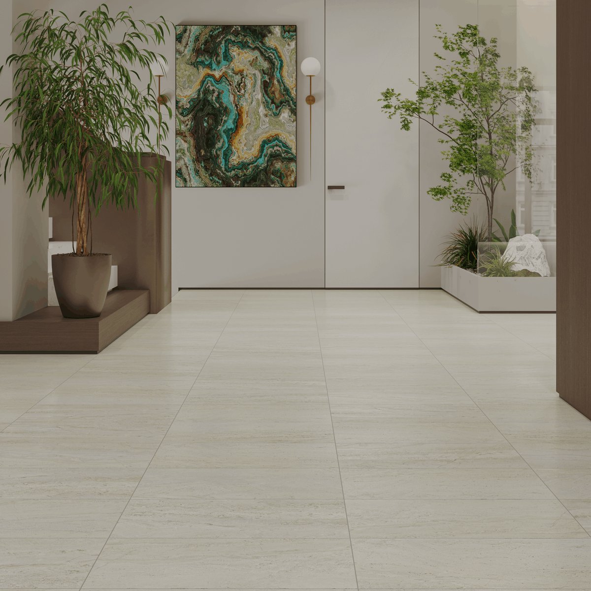 Плитка гармонично вписывается в стили минимализм, скандинавский, эко, современная классика и contemporary. Она отлично сочетается с мебелью из натурального дерева, текстилем в молочных и песочных оттенках, светлыми фасадами кухни и латунной либо чёрной фурнитурой.