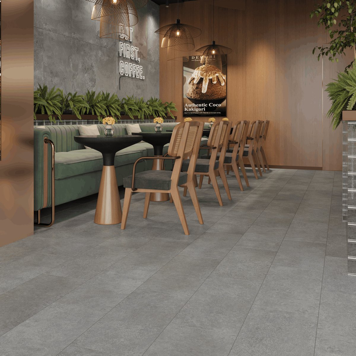 Формат 304×608 мм создаёт аккуратную прямоугольную раскладку с чёткой геометрией. Замковая система Click позволяет выполнять плавающий монтаж без клеевых составов. V-образная фаска 4V по периметру подчёркивает каждую плитку и усиливает эффект натурального камня.