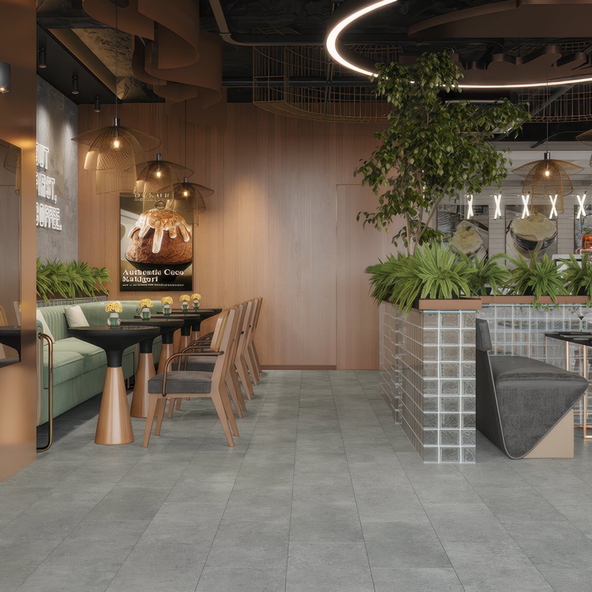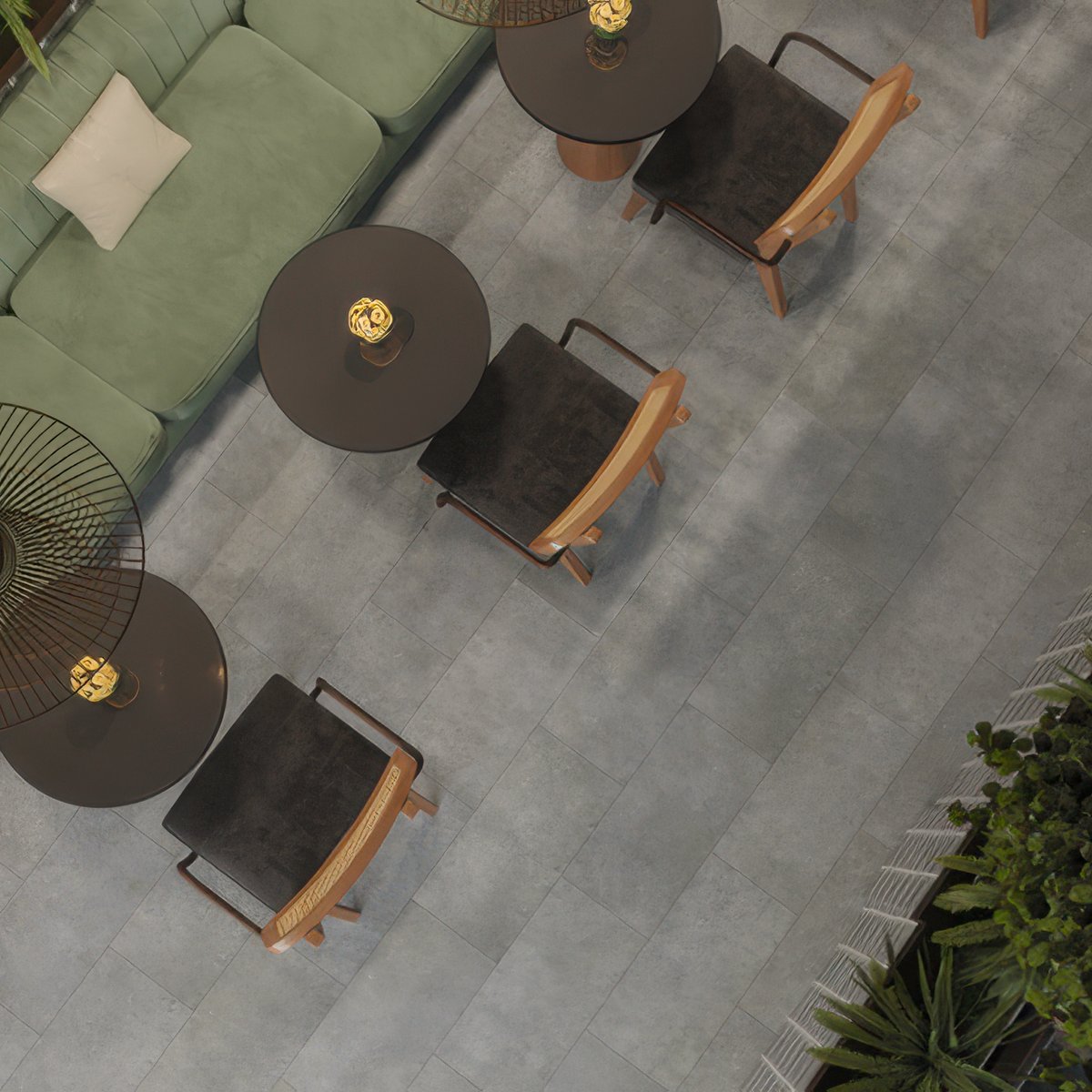 Плитка гармонично вписывается в стили лофт, минимализм, хай-тек и contemporary. Она отлично сочетается с чёрной и хромированной фурнитурой, стеклом, бетонными или светло-серым стенами, мебелью строгих форм и натуральным деревом холодных оттенков.