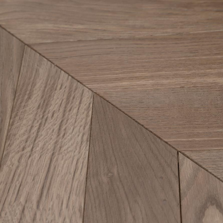 Планки размером 90×710 мм, толщиной 15 мм, выполнены на базе двухслойной инженерной конструкции: ценный дубовый верхний слой уложен на прочное влагостойкое основание, что обеспечивает стабильность геометрии и долговечность покрытия. Точное соединение «шип-паз» гарантирует плотную укладку, а фаска 4V подчёркивает четкость линий и акцентирует узнаваемый рисунок французской ёлки. Поверхность обработана матовым лаком, который сохраняет природный рельеф древесины и обеспечивает комфортное восприятие без блеска.