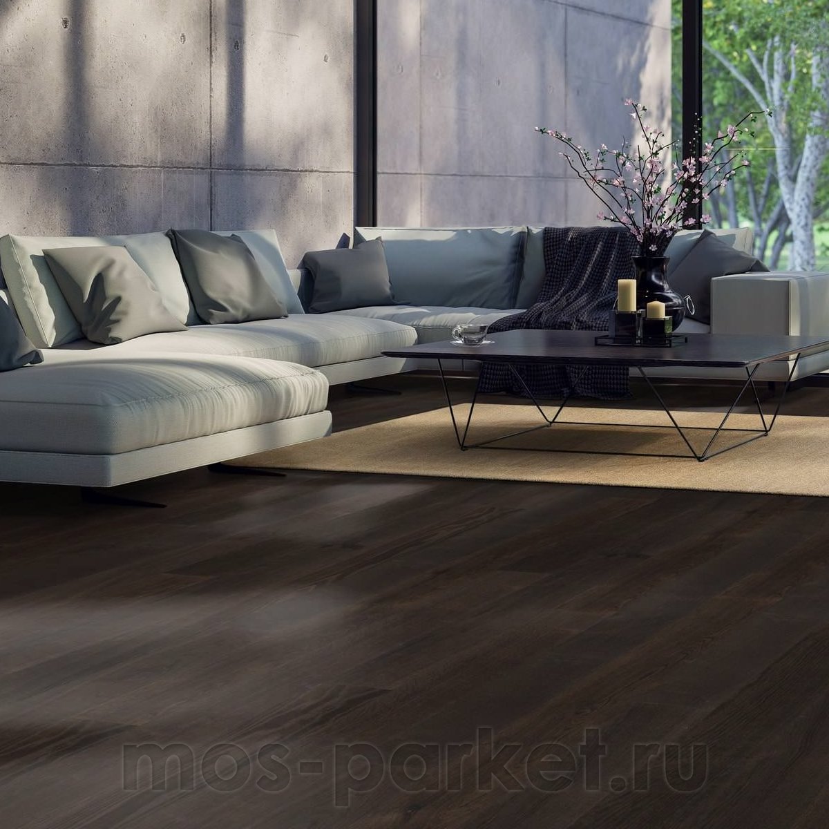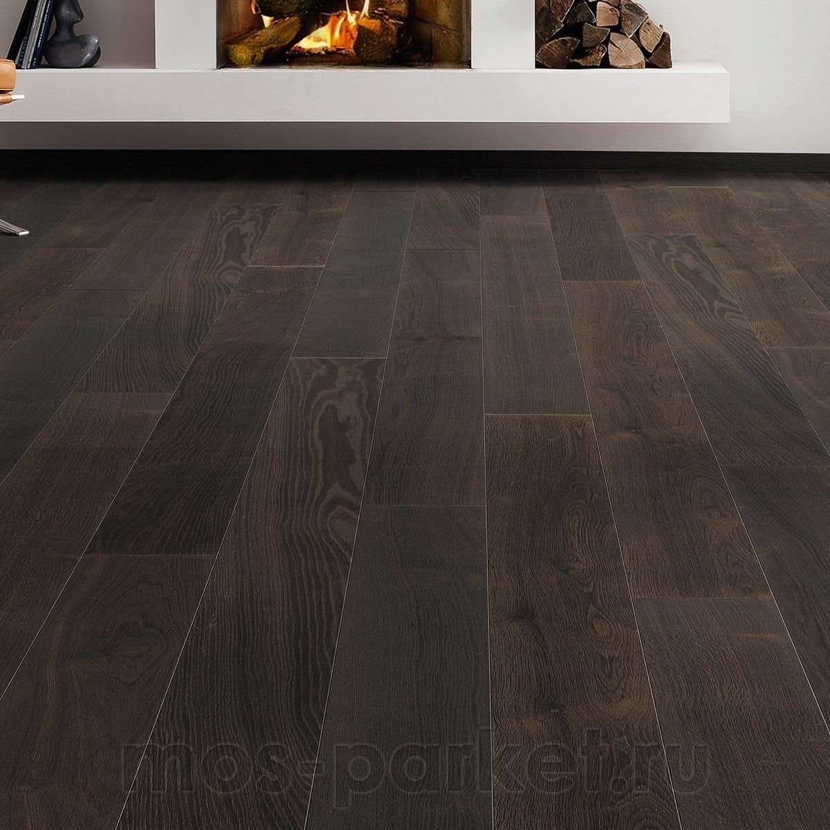 Такой декор особенно хорошо подойдёт для кабинета, гостиной, библиотеки, спальни или просторной кухни-гостиной, где хочется создать более камерную, статусную и уютную атмосферу. Он органично смотрится в классических, современных, лофт- и неоклассических интерьерах, хорошо сочетается со светлыми стенами, тёплым текстилем, чёрными акцентами и мебелью из натурального дерева. Это удачный выбор для тех, кто ищет тёмный дубовый пол с благородной глубиной цвета, спокойным рисунком и подчёркнутой древесной фактурой.