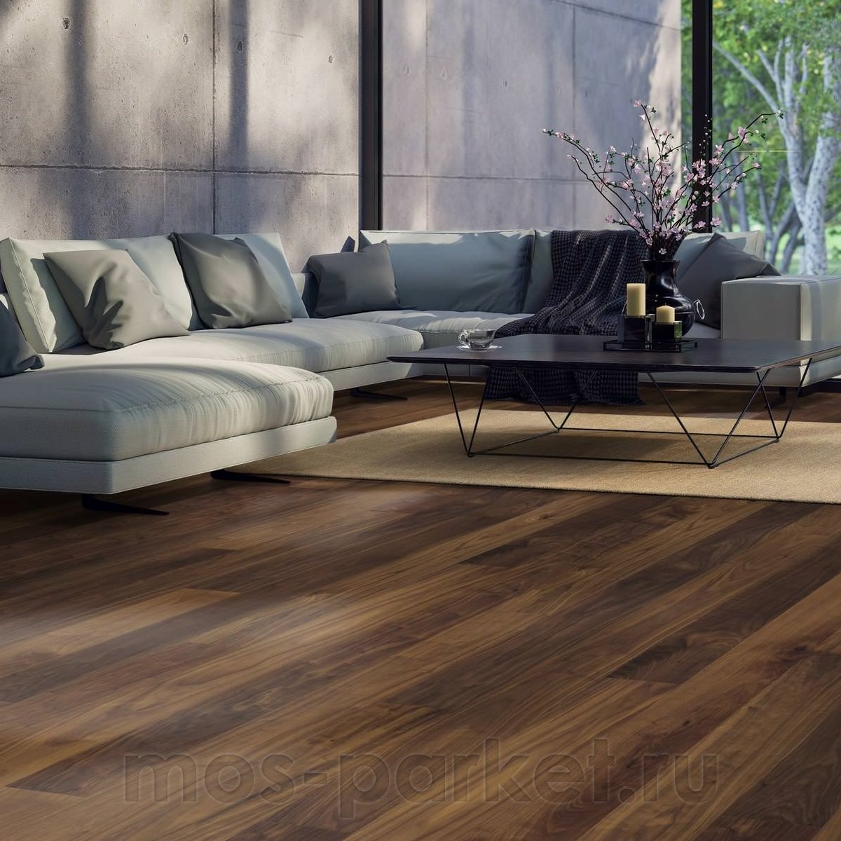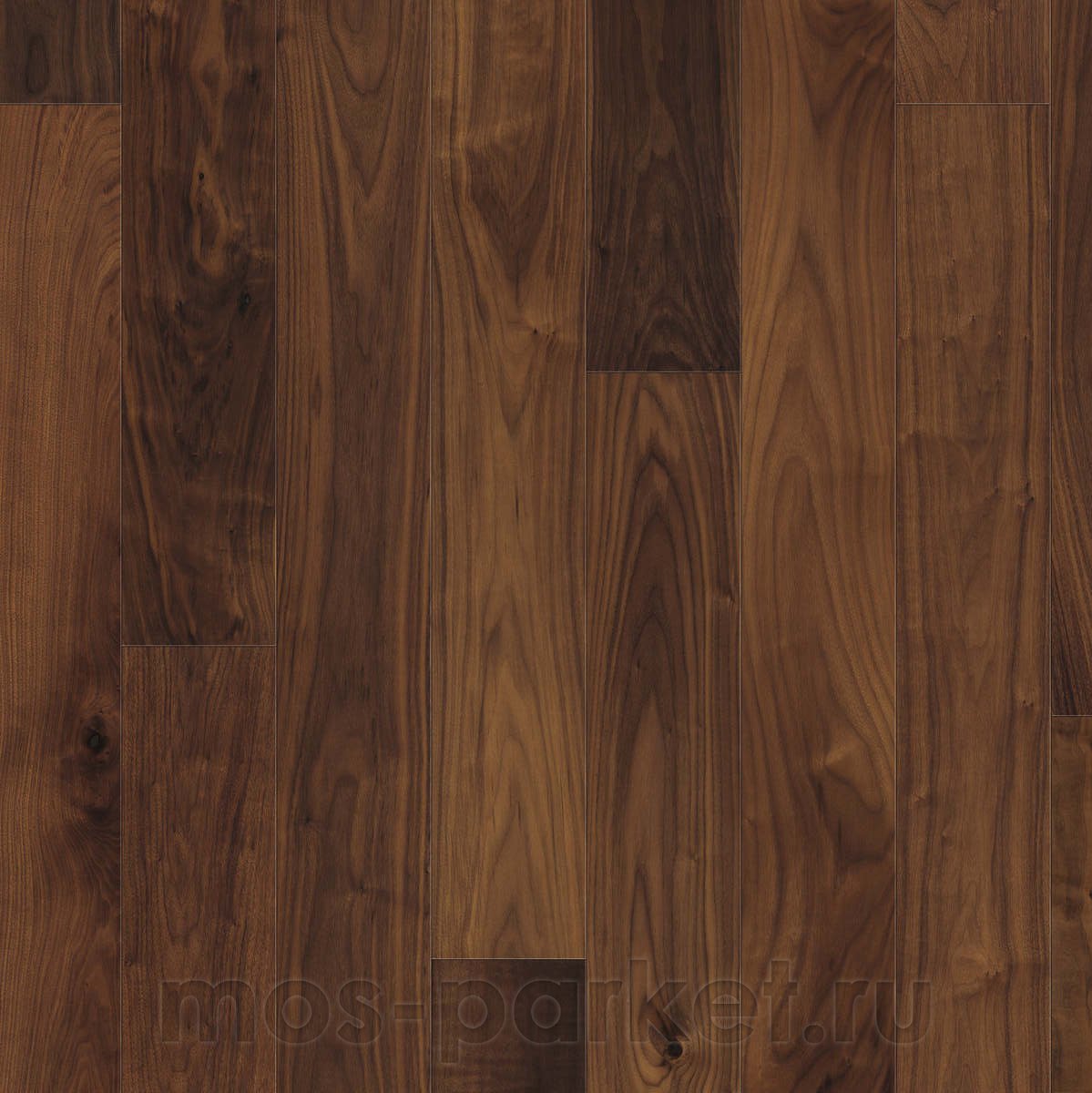 Тёмно-коричневая однополосная паркетная доска Haro 4000 Series 542086 Орех 4 американский Саваж покрыта матовым лаком naturaDur. Планки толщиной 13,5 мм на замковой системе Top Connect (5G) с фаской по периметру. В упаковке 8 планок размером 180×2200 мм, общей площадью 3,17 м². Гарантия производителя 30 лет.
