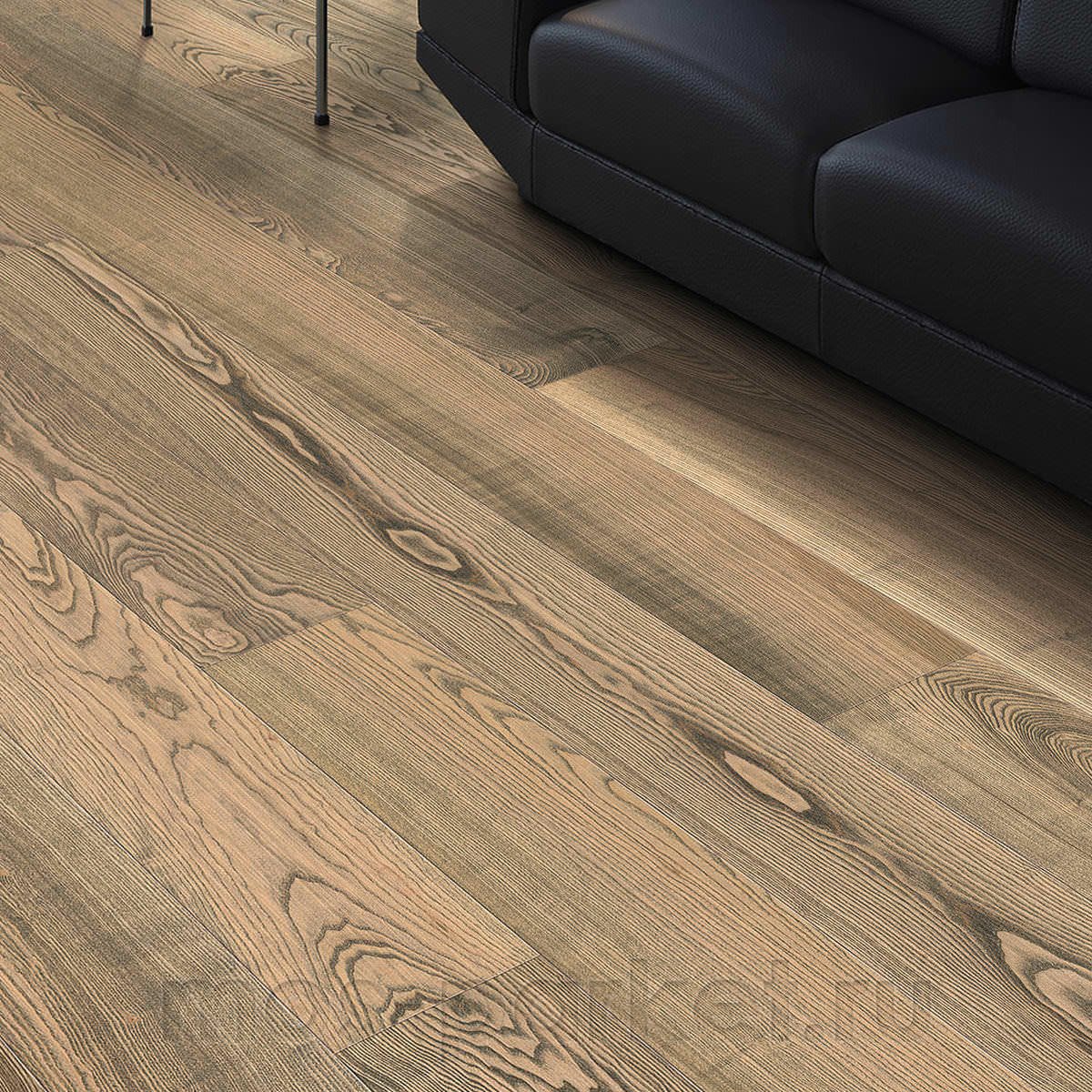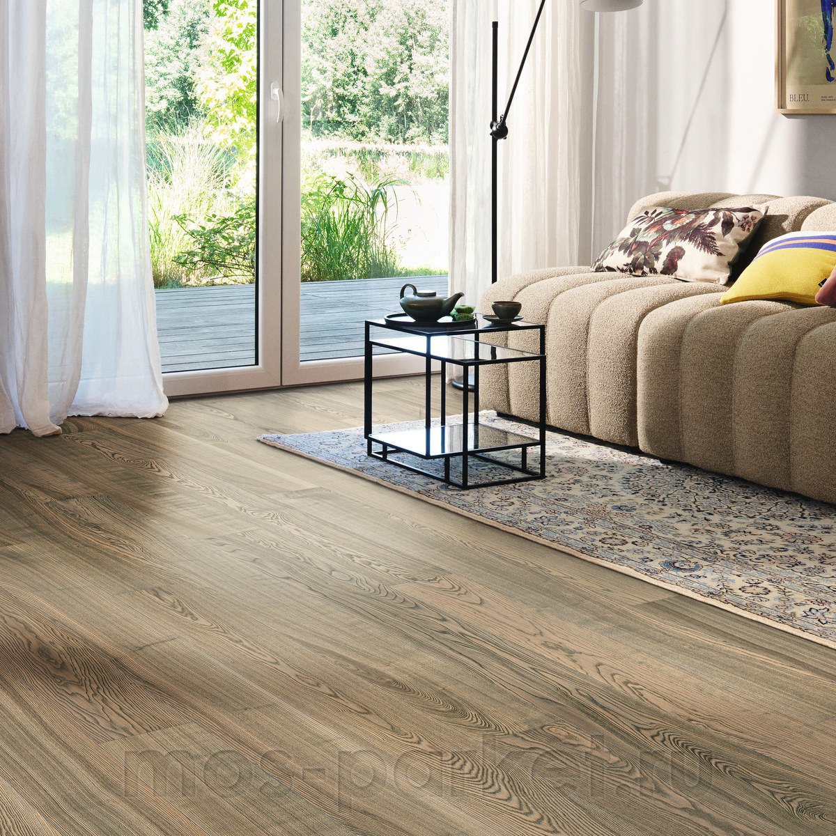 Серо-коричневая однополосная паркетная доска Haro 4000 Series 544625 Ясень табачно-серый Юниверсал ретро браш покрыта матовым лаком naturaDur. Планки толщиной 13,5 мм на замковой системе Top Connect (5G) с фаской по периметру. В упаковке 8 планок размером 180×2200 мм, общей площадью 3,17 м². Гарантия производителя 30 лет.