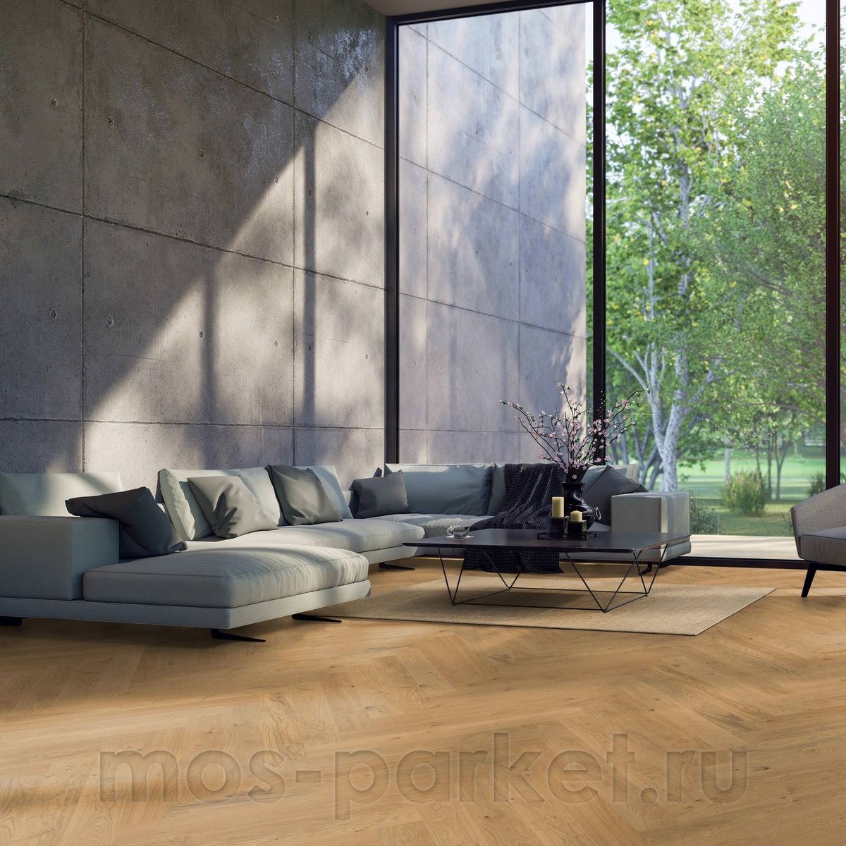 Планки размером 120×1000 мм при общей толщине 10 мм формируют классический рисунок английской ёлки с чёткой геометрией. Двухслойная инженерная конструкция с рабочим слоем дуба 3,5 мм обеспечивает стабильность покрытия и долговечность. Монтаж осуществляется клеевым способом, соединение шип-паз (Tongue & Groove, T&G) позволяет добиться плотной стыковки элементов. Покрытие подходит для использования с тёплым полом. Гарантия 30 лет.