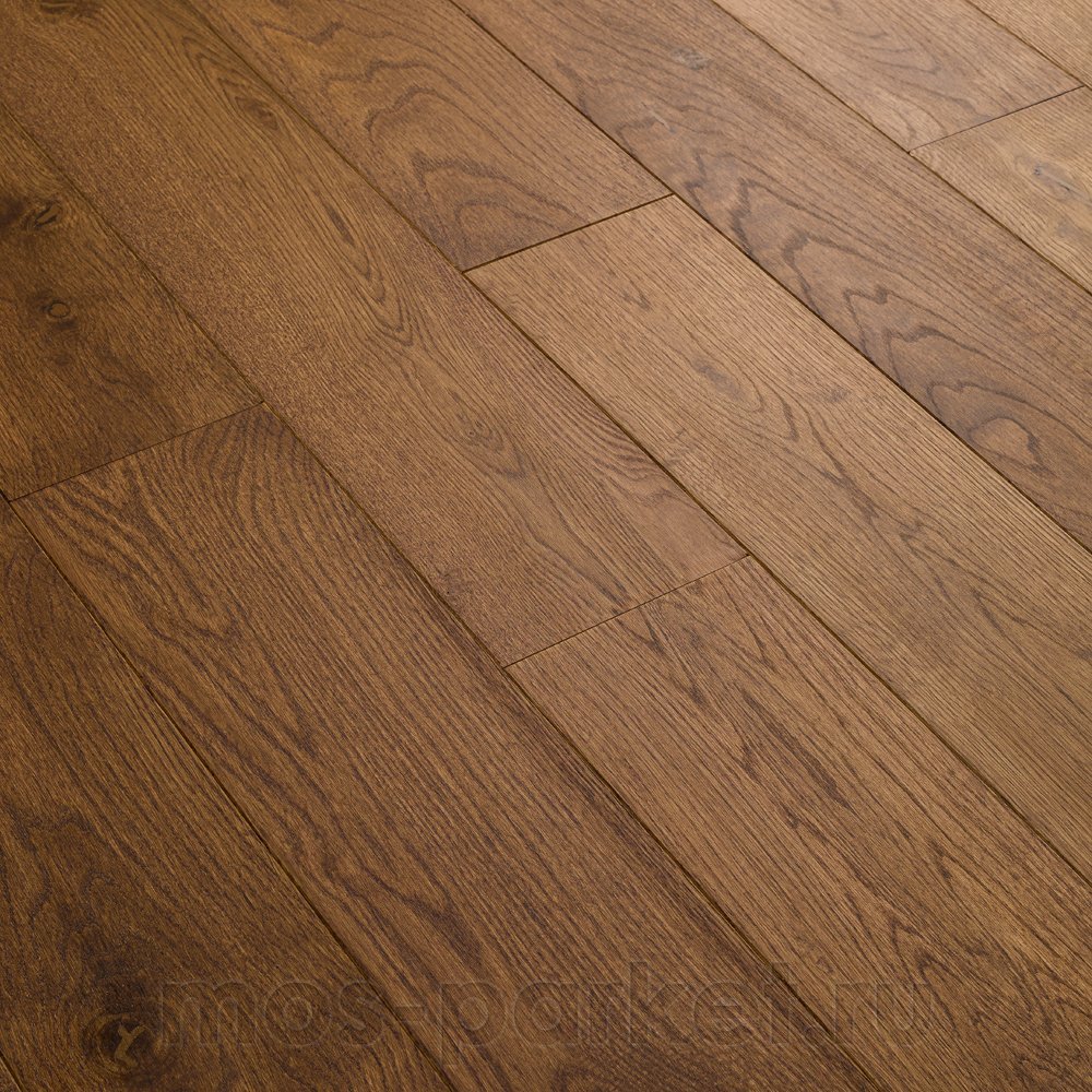 Инженерная доска «Дуб Ария» в селекции «Рустик» привлекает внимание своим насыщенным, благородным темно-коричневым оттенком. Этот цвет напоминает крепкий кофе или темный шоколад, создавая в помещении атмосферу респектабельности и уюта. Особенность сортировки «Рустик» заключается в контрастных вариациях цветовых оттенков, характерных для натуральной древесины. На поверхности ярко выражены естественные перепады цвета, а также допускаются живые и темные сросшиеся сучки и трещины размером до 45 мм, которые профессионально шпатлюются в тон общего покрытия.