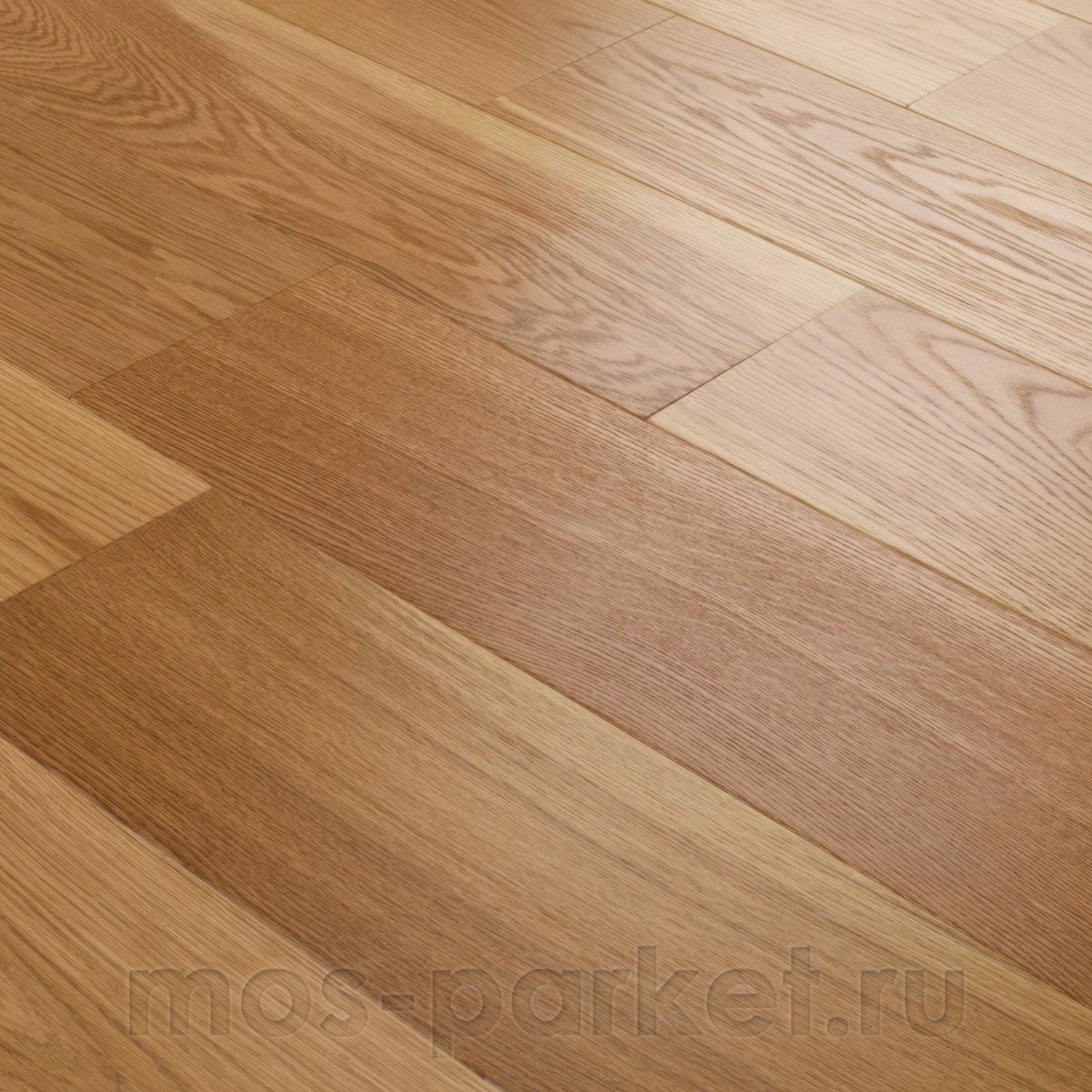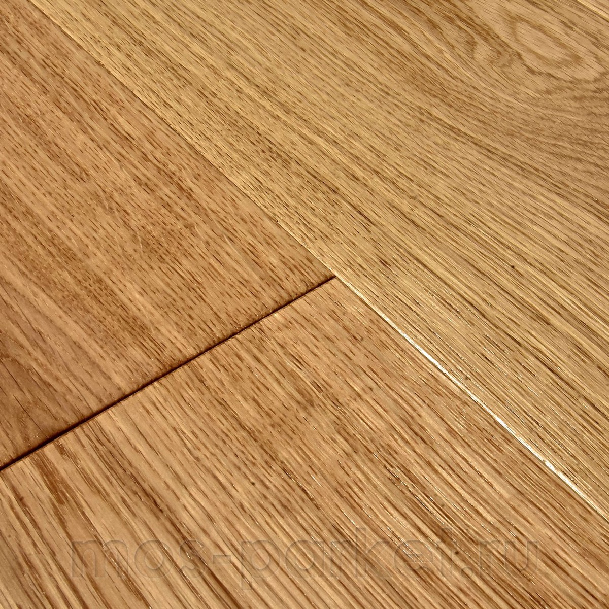 В основе доски - берёзовая влагостойкая фанера, сверху - натуральный дуб толщиной 3 мм. Такая конструкция хорошо переносит перепады температуры и подходит для использования с тёплыми полами. Длина досок варьируется от 400 до 1300/1500 мм, ширина - 180 мм. Благодаря этому покрытие выглядит как цельное полотно и легко адаптируется к разным помещениям. V-образная фаска выделяет каждую доску, делая рисунок пола более выразительным. Замковое соединение "гребень‑паз" позволяет укладывать покрытие как на клей, так и плавающим способом.