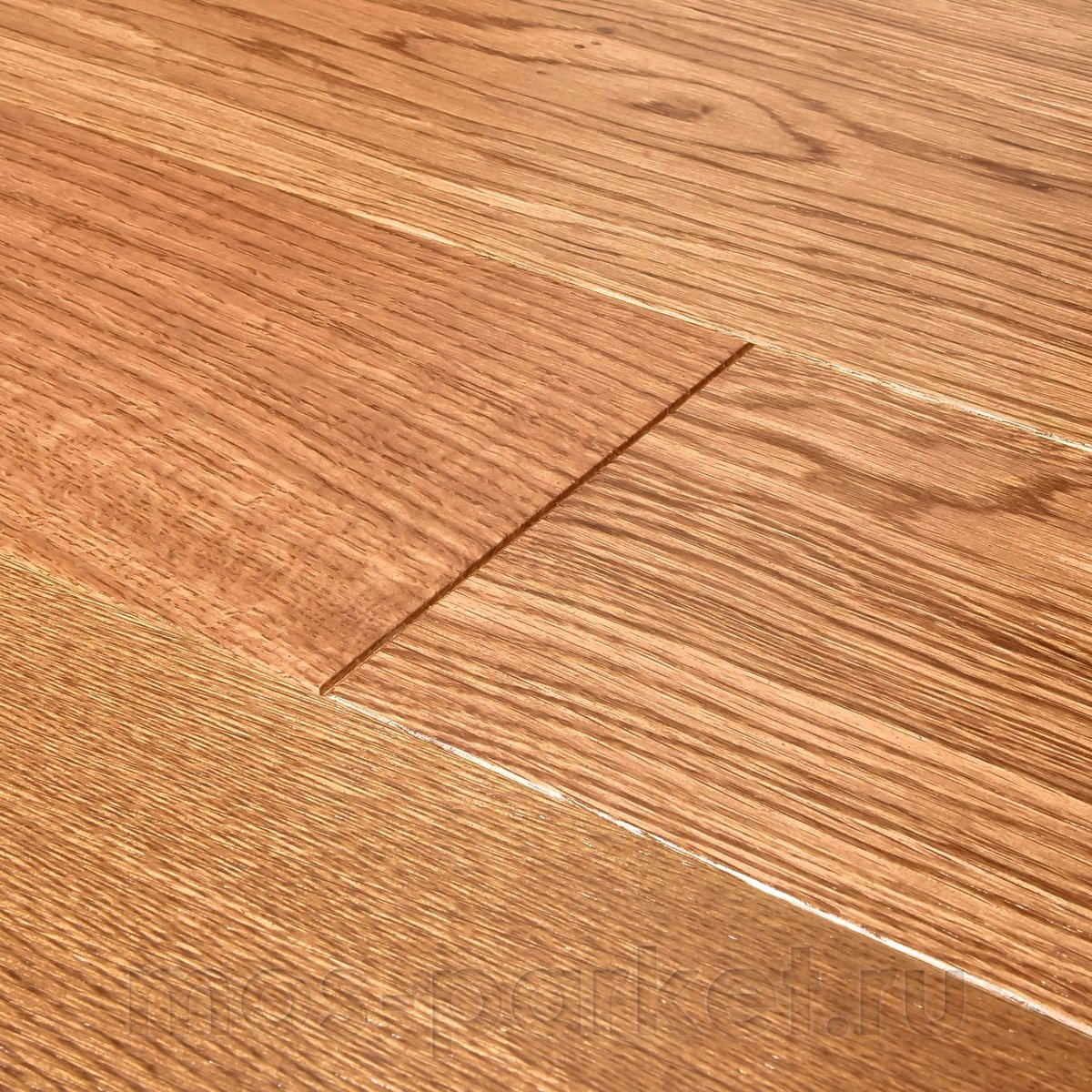 Двухслойная конструкция доски состоит из верхнего слоя натурального дуба толщиной 3 мм и прочной влагостойкой берёзовой фанеры в основании. Размер плашек составляет 145×1300 мм, общая толщина - 15 мм. По периметру выполнена аккуратная V-образная фаска, подчёркивающая геометрию доски. Соединение - надёжный гребень‑паз, обеспечивающий плотную стыковку при укладке.