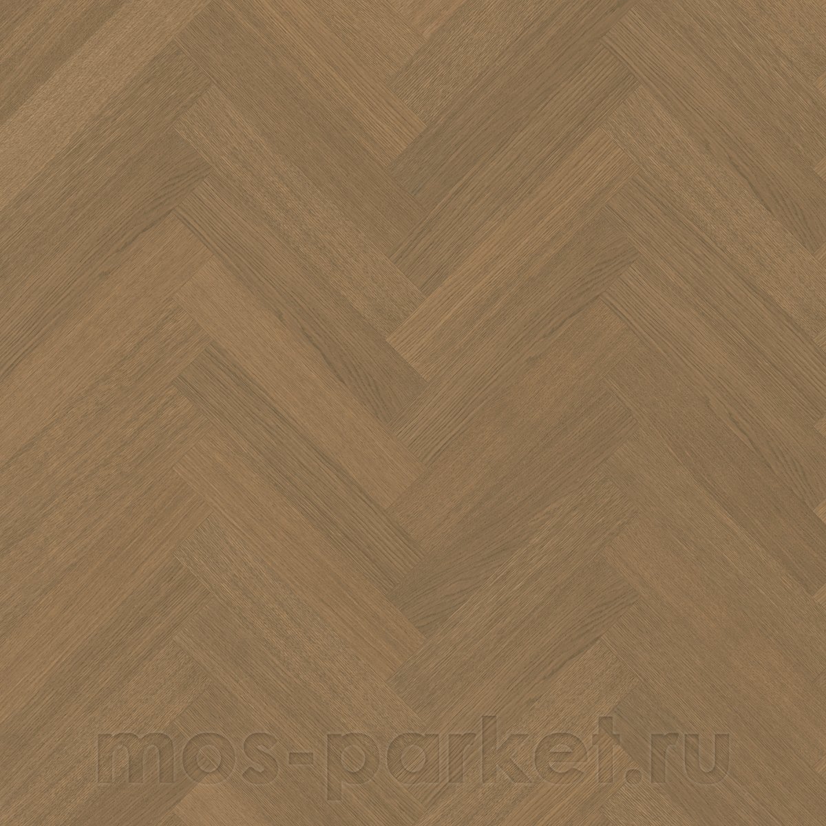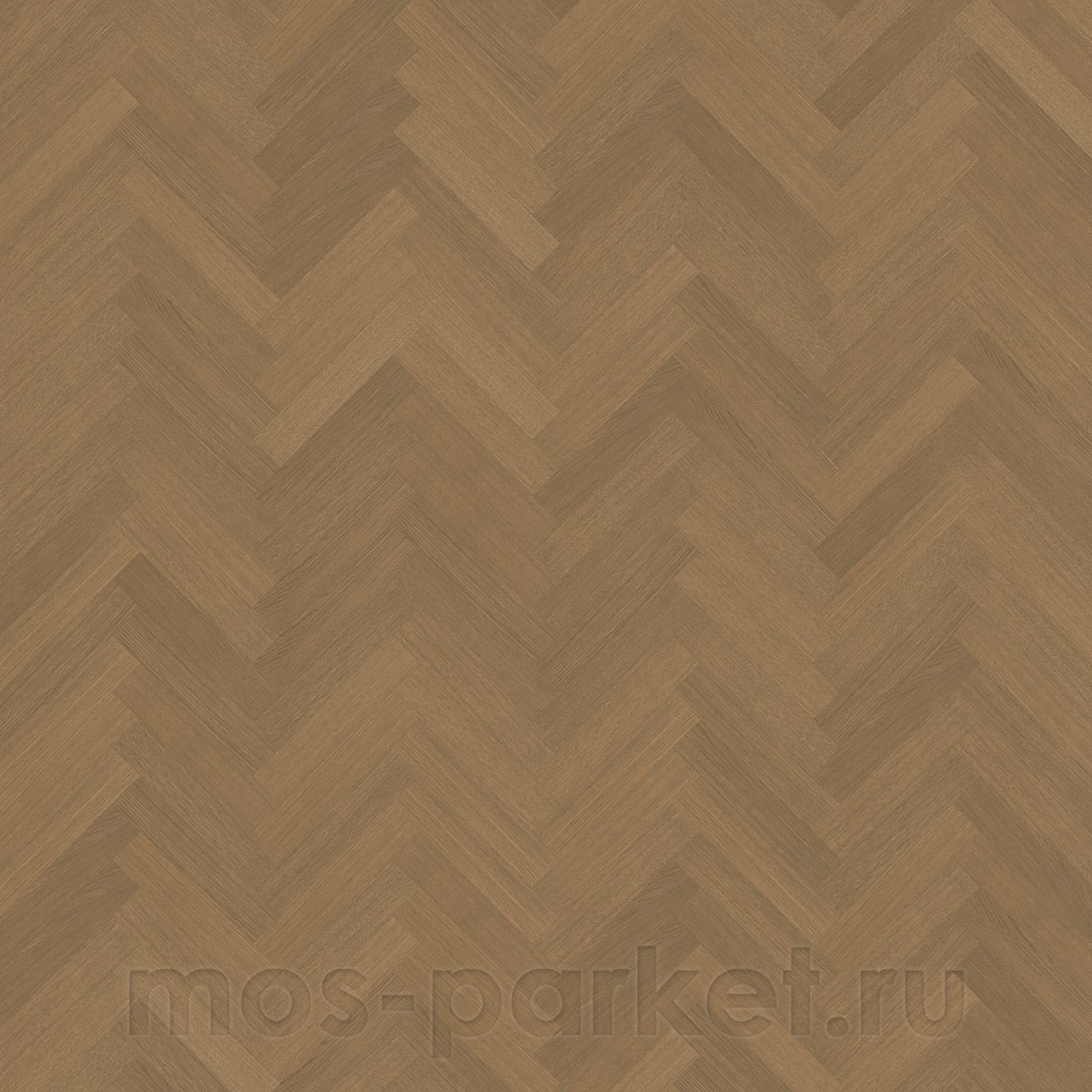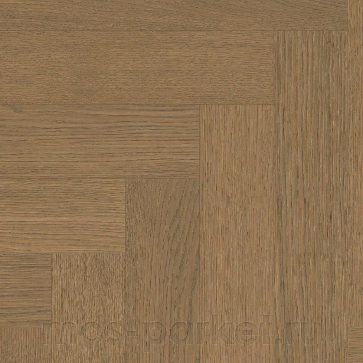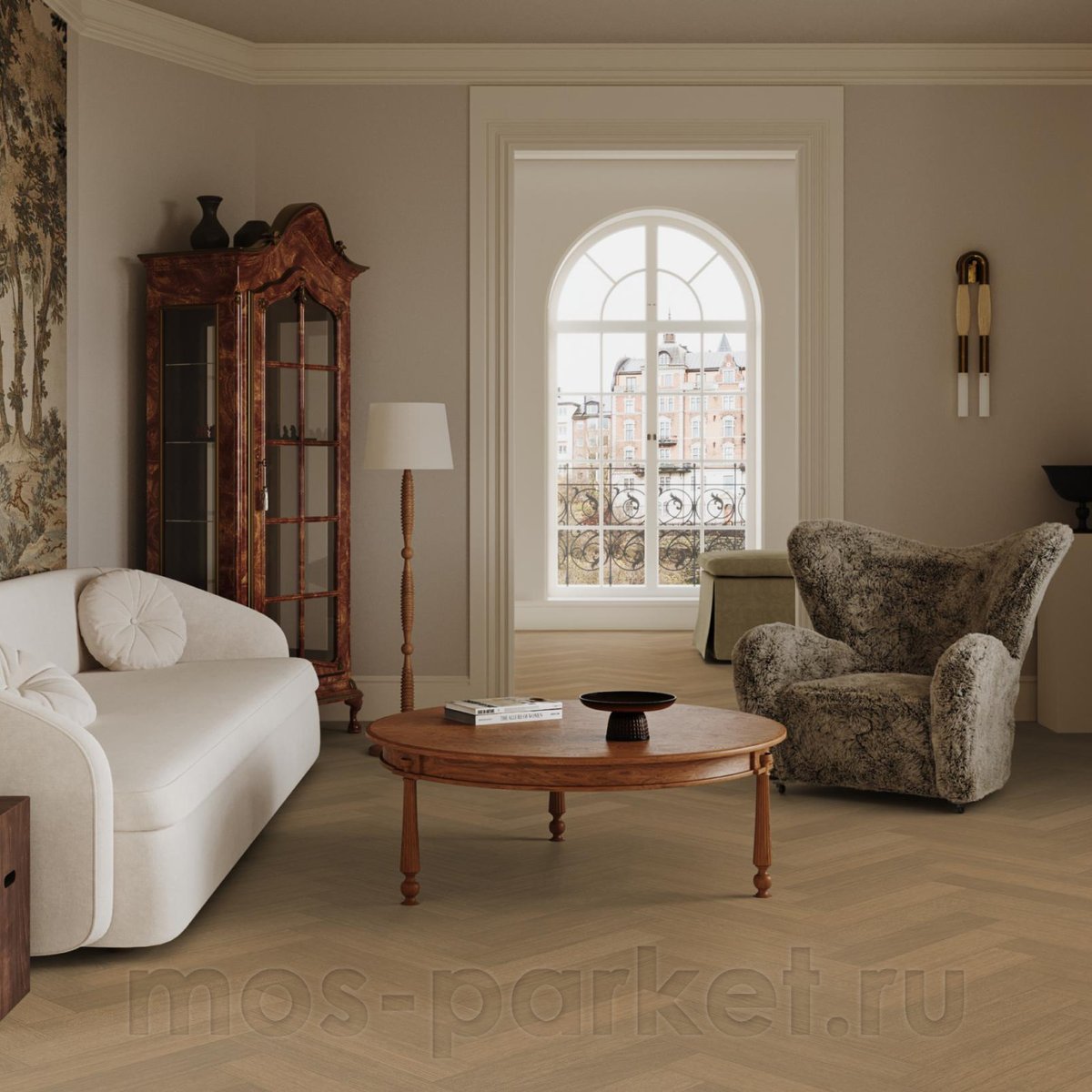 Покрытие относится к коллекции Life Authentic Herringbone и выполнено на стабильной HDF-основе, что обеспечивает надёжную геометрию и устойчивость к повседневным нагрузкам. Общая толщина доски составляет 10 мм, верхний слой из натурального дуба толщиной 0,6 мм подчёркивает статус натурального деревянного пола. Ультра-матовый лак в сочетании с брашированной поверхностью раскрывает текстуру древесины, делает её визуально мягкой и тактильно приятной, при этом исключая эффект блеска. Фаска по четырём сторонам аккуратно подчёркивает каждую паркетину и усиливает выразительность классической укладки ёлочкой.