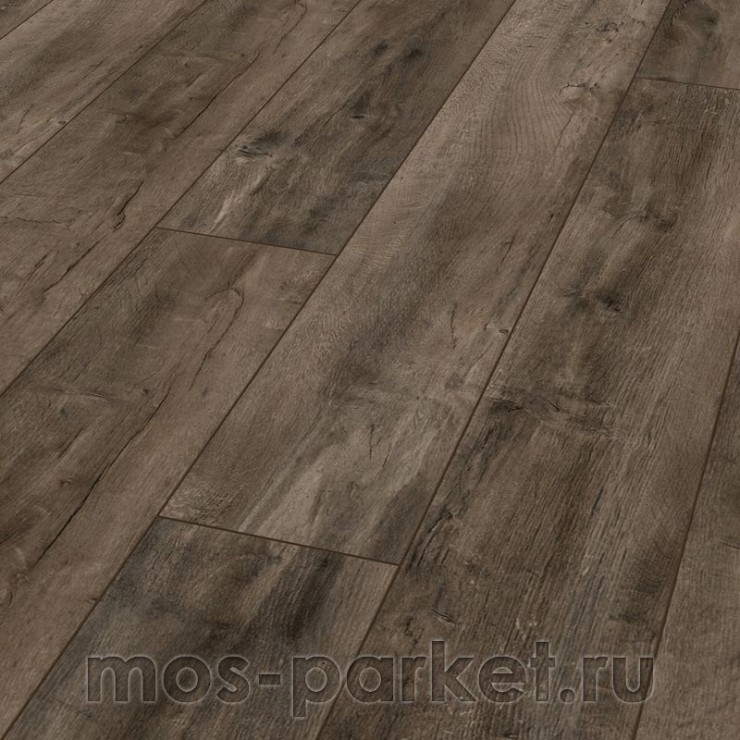 Однополосный темно-коричневый ламинат 33 класса Aqua Robusto Дуб Тайлор повышенной влагостойкости с V-образной фаской по периметру. В одной упаковке 5 досок размером 1380х191х12 мм общей площадью 1.318 м². Подходит для помещений с повышенной влажностью.Весь ламинат Kronotex