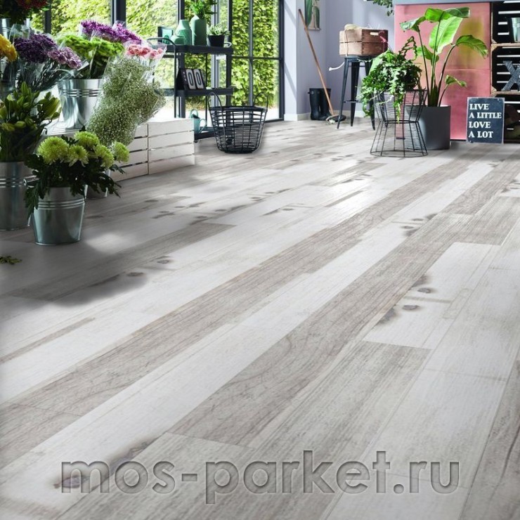 Светло-серый однополосный ламинат 32 класса с матовой поверхностью под дерево. Планки декора D 6407 Плей снабжены замковой системой EXPRESS CLICK и не имеют фаски. Толщина 8 мм. Гарантия 25 лет.