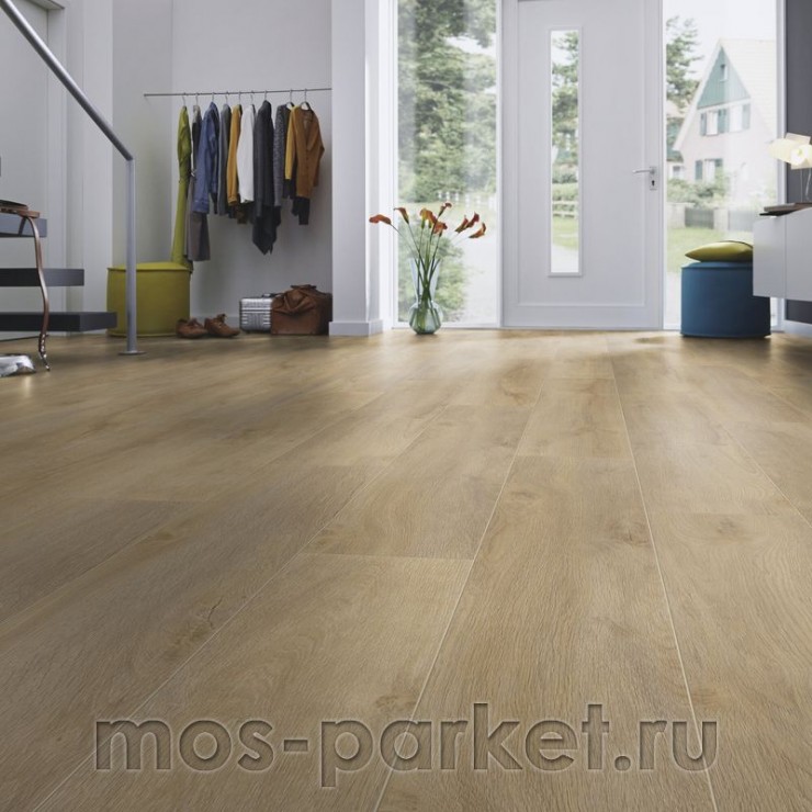 Влагостойкий ламинат 33-го класса, от германского производителя Kronotex (Кронотекс), предложил данную модель из коллекции Robusto в модном цвете Дуб Премиум. В одной упаковке 1,293 м2 состоящая из 5 панелей размером 1375х188х12 мм. V-образная фаска по периметру доски.