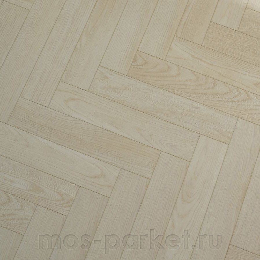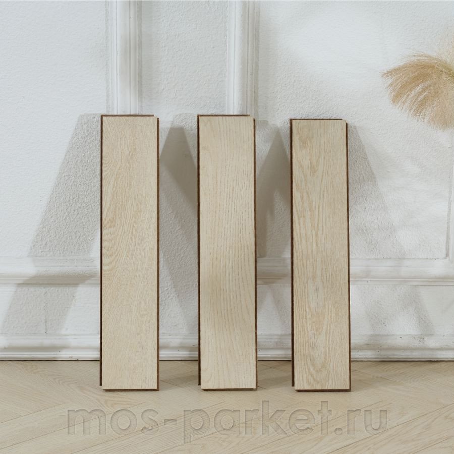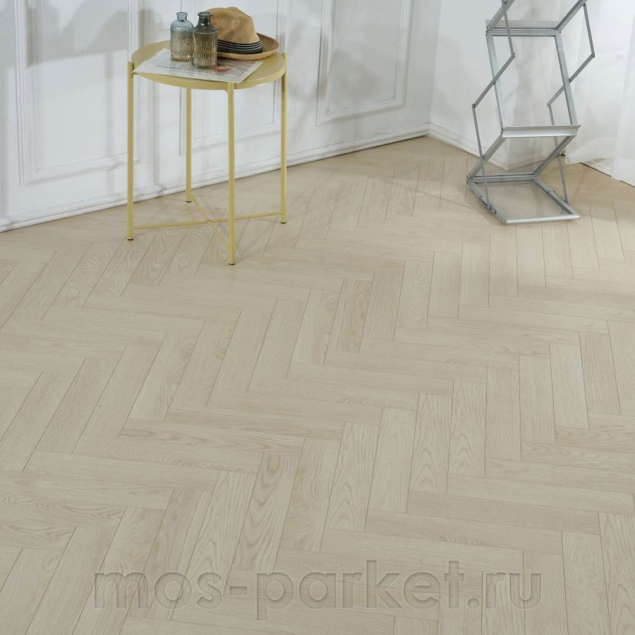 Эстетика «Дуба Ковентри» строится на нюансах. Поверхность планок матовая, с деликатной синхронной текстурой, которая не просто имитирует рисунок дерева, но и повторяет его рельеф на ощупь. Цвет сложный и многогранный: это не плоский белый, а переплетение оттенков топленого молока, ванили и светлого ясеня. V-образная фаска по периметру каждой планки (400×80 мм) добавляет полу графичности, не давая светлому полотну сливаться в единое пятно.