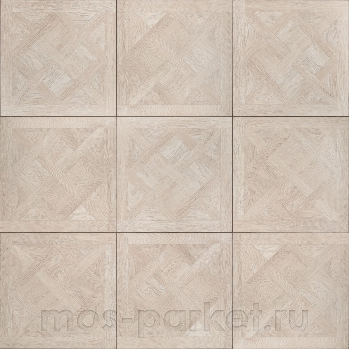 Декор выполнен в светлом, слегка выбеленном дубе с мягкой, естественной текстурой древесины. Версальский рисунок выглядит сбалансированно и аккуратно, без резких контрастов, благодаря чему поверхность воспринимается цельной и визуально спокойной. Четырёхсторонняя крашенная фаска подчёркивает каждый модуль, добавляя полу глубины и архитектурной выразительности, характерной для классического паркета.