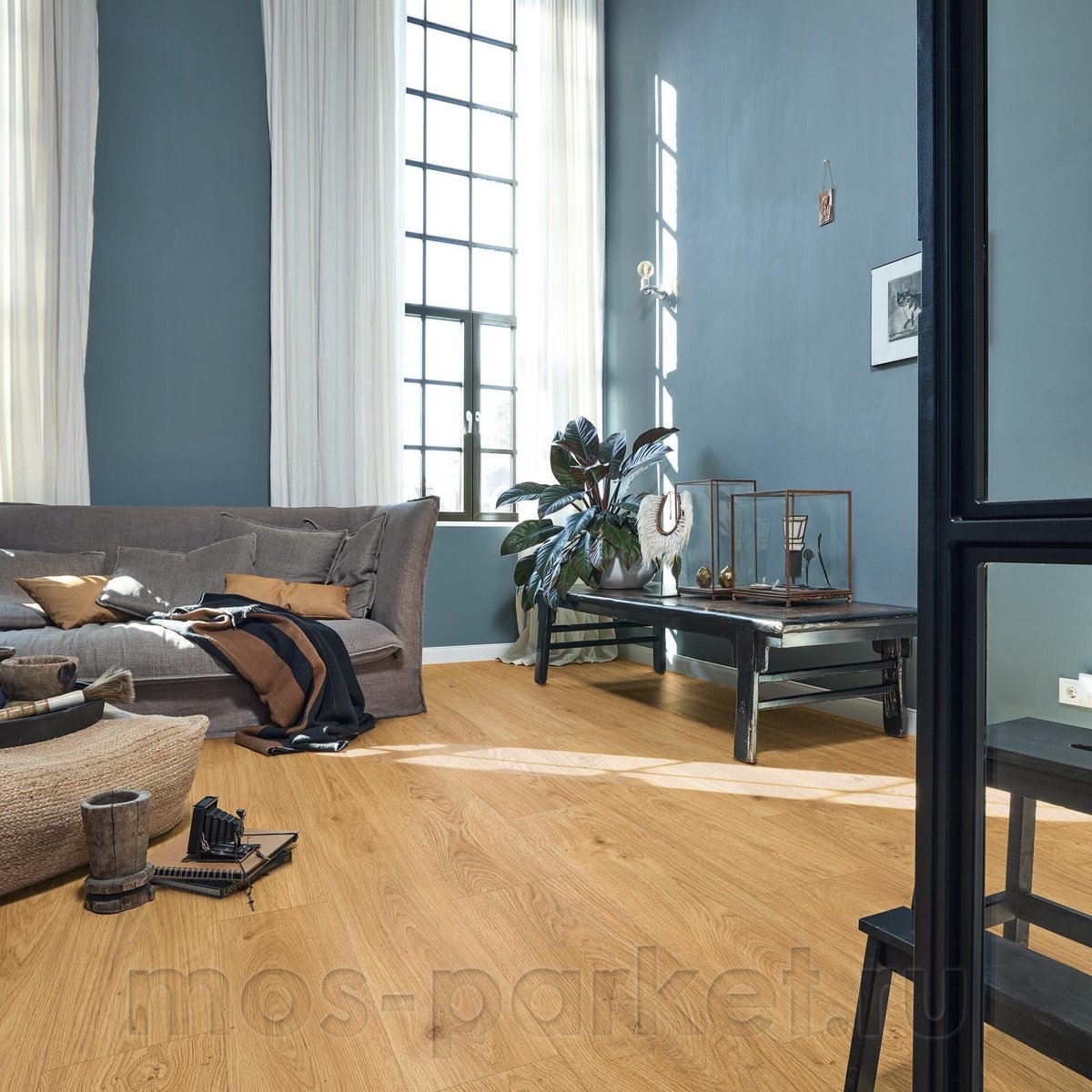 Ламинат изготовлен на плотной HDF-основе и имеет толщину 10 мм, что обеспечивает стабильность покрытия и комфорт при ежедневной эксплуатации. Формат планки 244×1288 мм подчёркивает естественную структуру древесины и формирует аккуратное, цельное напольное полотно. Замковая система Multiclic обеспечивает надёжную фиксацию панелей и позволяет выполнять плавающую укладку без применения клея.