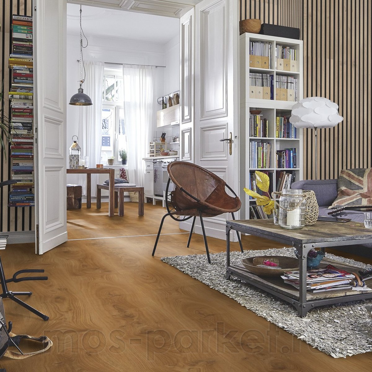 Ламинат выполнен на плотной HDF-основе и имеет толщину 10 мм, обеспечивая стабильность покрытия и комфорт при ходьбе. Увеличенный формат планки 248×2052 мм подчёркивает протяжённость древесного рисунка и формирует эффект цельного, монолитного пола, особенно выразительный в просторных помещениях. Замковая система 5G Dry позволяет выполнять быструю плавающую укладку без клея и обеспечивает плотное соединение панелей.