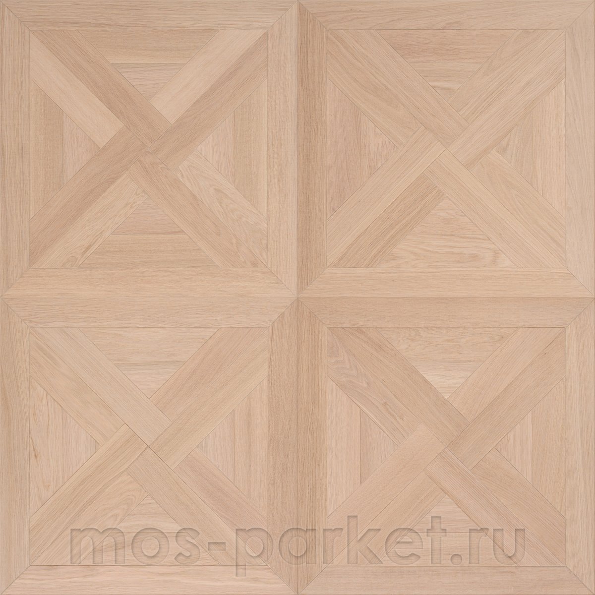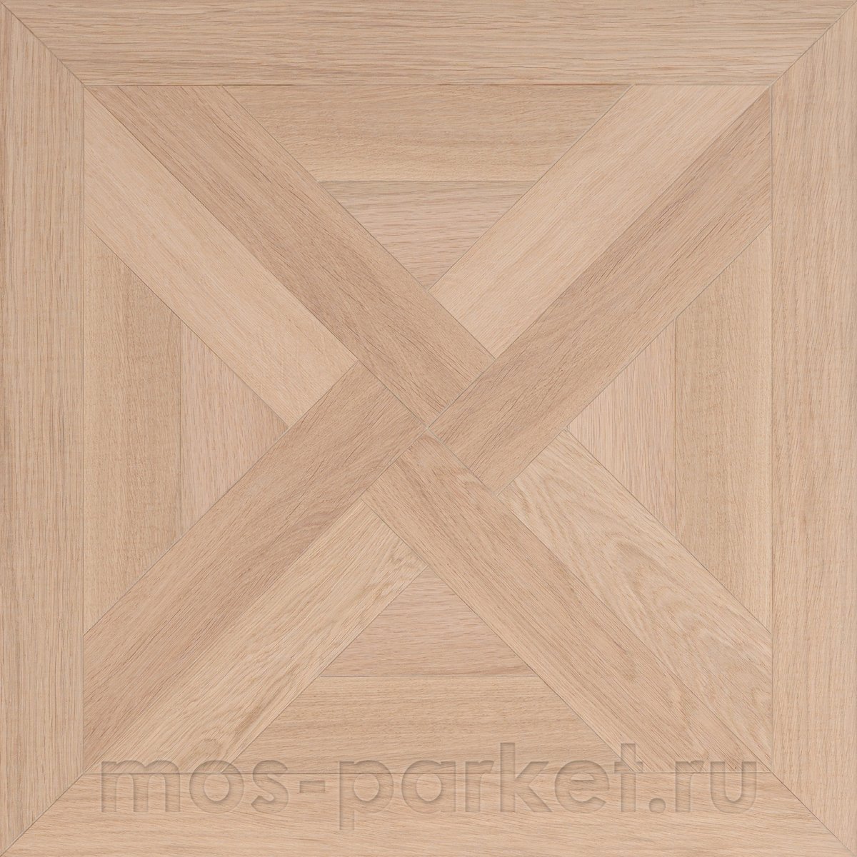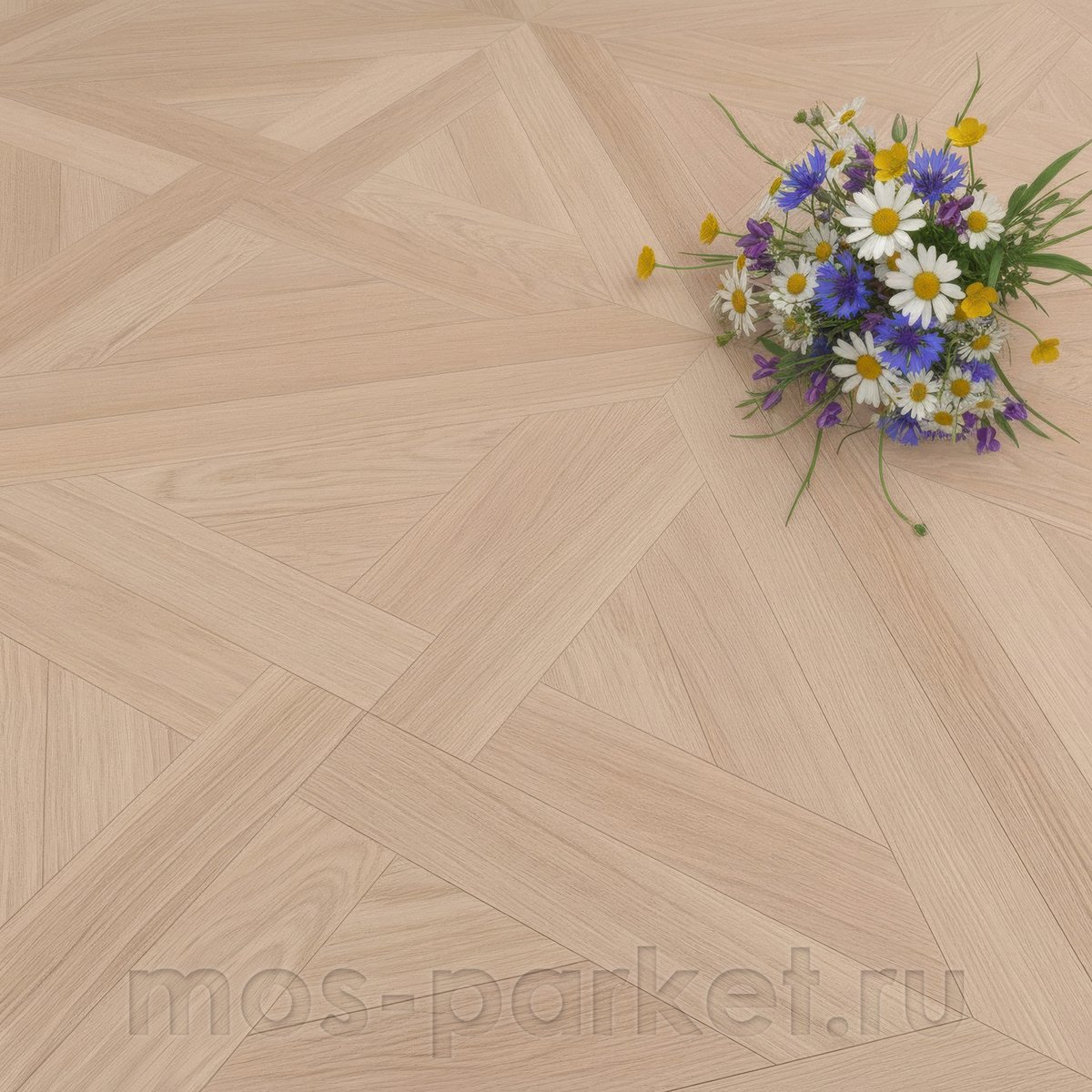 Модульный паркет Coswick Трианон Дуб Титановый буфф сочетает строгую графику классического узора и мягкий современный оттенок дуба. Рисунок «Трианон» построен на пересекающихся диагоналях, которые складываются в симметричный орнамент, придающий полу упорядоченность и выразительность.