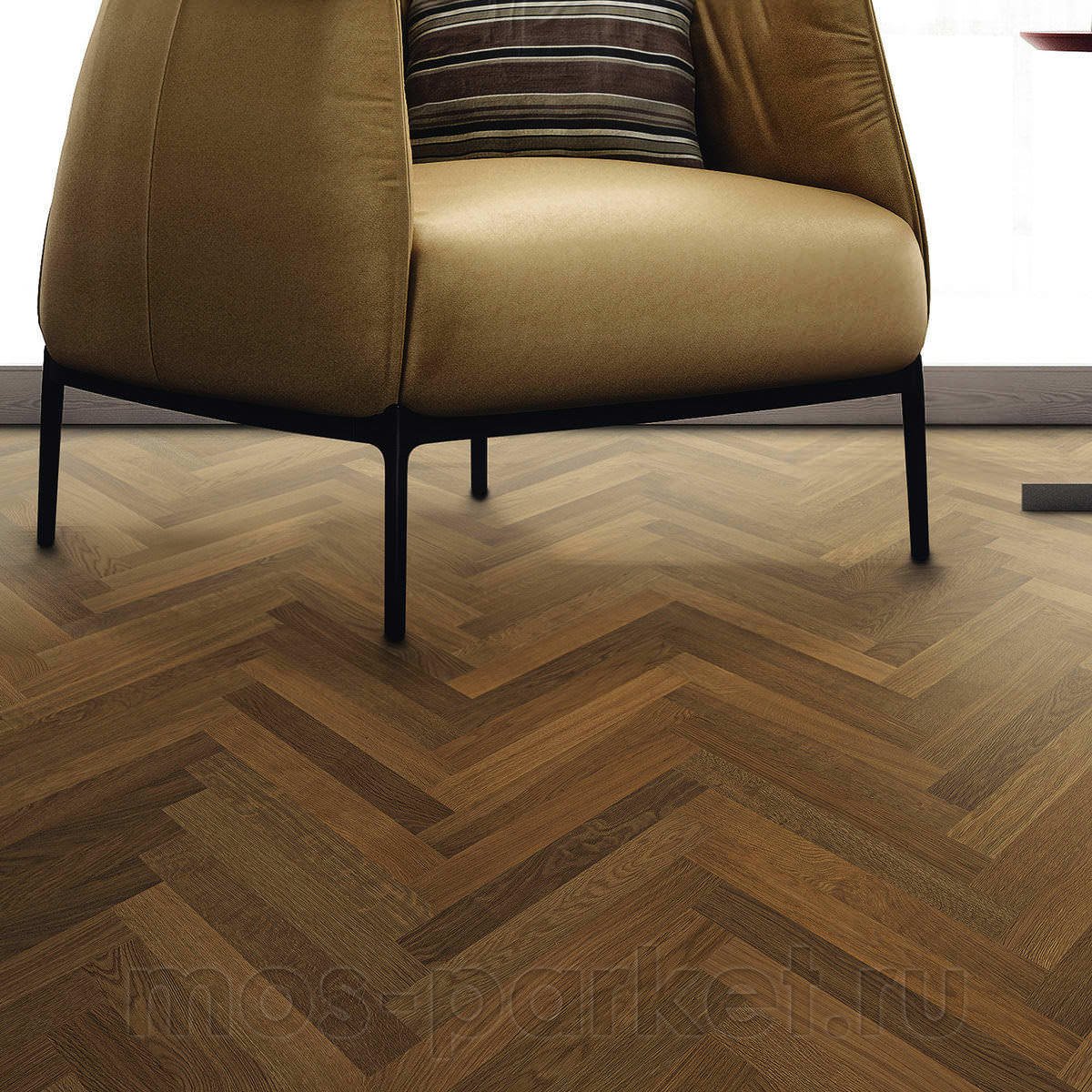 Формат планки 70×490 мм позволяет сформировать аккуратный и детализированный рисунок английской ёлки. Такой размер элементов делает узор более динамичным и визуально структурирует пространство. Паркет органично смотрится как в классических интерьерах, так и в современных проектах, где важна выразительная текстура натуральной древесины. Конструкция покрытия двухслойная инженерная, с верхним слоем дуба 3,5 мм, что обеспечивает стабильность геометрии и длительный срок службы.