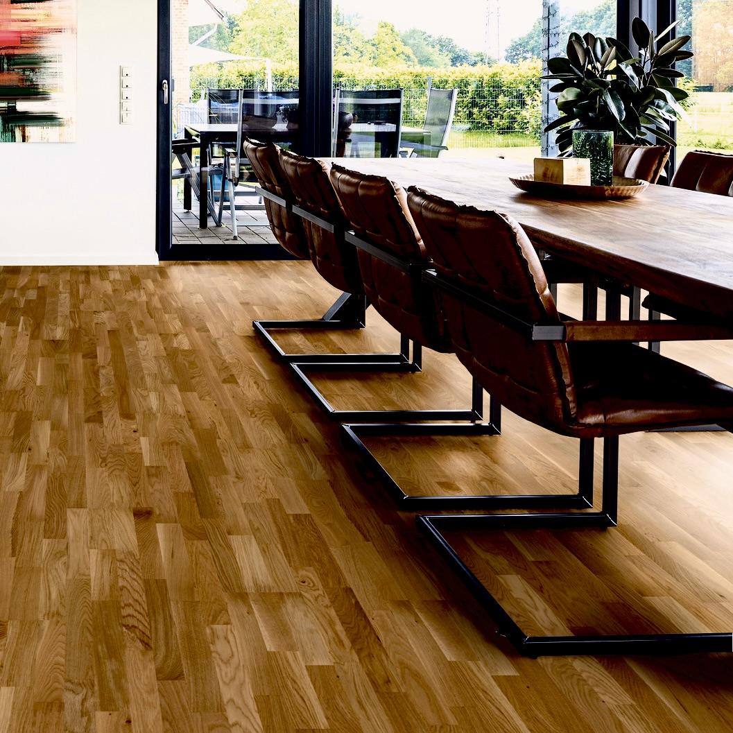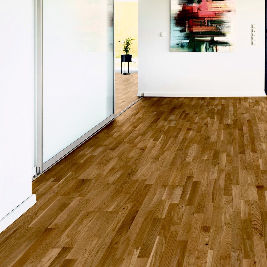 Трёхполосная паркетная доска Blanco Дуб Prime 3S коричневого цвета от производителя Karelia-Upofloor. Доски толщиной 14 мм на замковой системе RealLoc не имеют фаски. Верхняя ламель дуба 3,5 мм в селекции Кантри / Робус покрыта матовым лаком. Напольное покрытие Дуб Прайм (3011348А6060143) продаётся упаковками по 8 досок размером 188×2266 мм общей площадью 3,41 м². Предоставляется гарантия производителя в 10 лет для бытовых помещений.