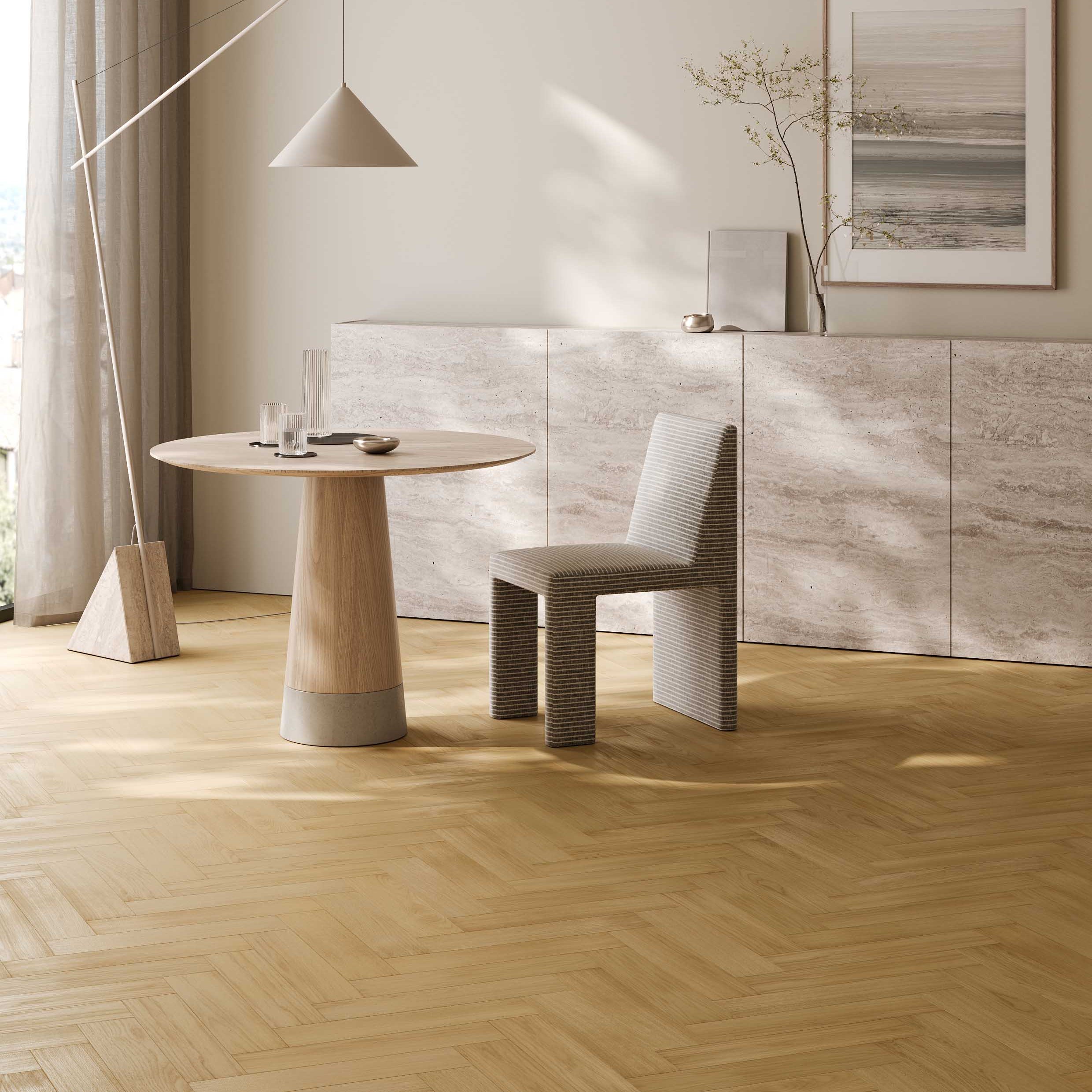 Штучный паркет Quartz Parquet - это формат «малых планок», который позволяет делать разные рисунки укладки (ёлочка, блок, палуба) и точнее подстроиться под геометрию помещения. Влагостойкие планки можно укладывать в помещениях с повышенной влажностью, на тёплый пол без порогов до 144 м², т.к. формат рассчитан на современные сценарии, где важна влагостойкость и единый контур без порогов.