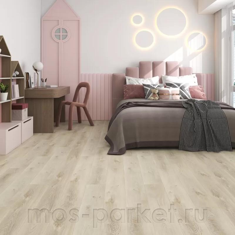 Декор выполнен в светло-бежевой гамме с холодноватым северным подтоном и аккуратным древесным рисунком. Матовая поверхность и естественная текстура дуба создают эффект натурального паркета, визуально приближая виниловый пол к деревянному покрытию. Рисунок смотрится равномерно и спокойно, без резких контрастов, что особенно ценят дизайнеры интерьеров.