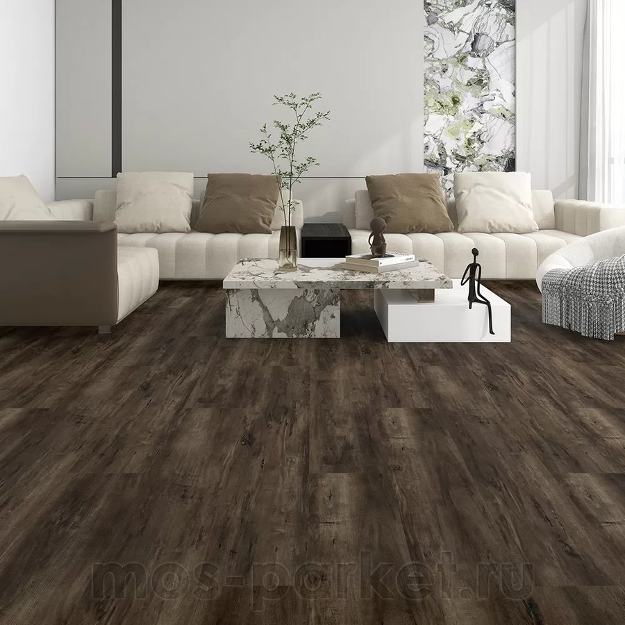 Декор выполнен в тёмно-коричневой гамме с выраженной текстурой древесных волокон и эффектом лёгкого состаривания. Матовая поверхность убирает лишний блеск и усиливает ощущение натурального дерева. Рисунок выглядит живо и неоднородно, благодаря чему пол смотрится глубоко и интересно даже в больших помещениях.