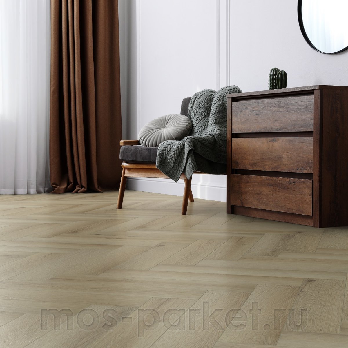 AF7502SOU отличается более тёплым, слегка медовым оттенком дуба с живыми древесными волокнами и деликатными природными акцентами. Тиснение «в регистр» подчёркивает глубину текстуры и делает поверхность максимально близкой к натуральному дереву. Четырёхсторонняя крашенная фаска, подобранная в цвет декора, аккуратно выделяет каждую планку, усиливая геометрию рисунка ёлочки и добавляя полу объёма.