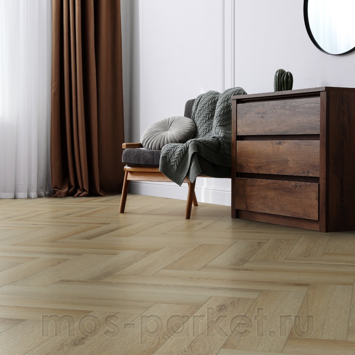 Декор AF7506SOU из коллекции Soundless от AquaFloor - это светлый натуральный дуб с мягким тёплым подтоном, выполненный в формате классической английской ёлочки. Он формирует лёгкий, уютный и визуально «чистый» пол, который делает пространство светлее, просторнее и гармоничнее, сохраняя при этом статус премиального покрытия.