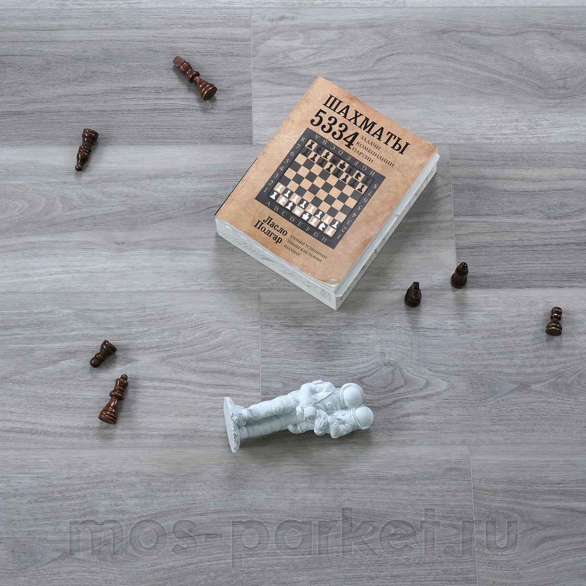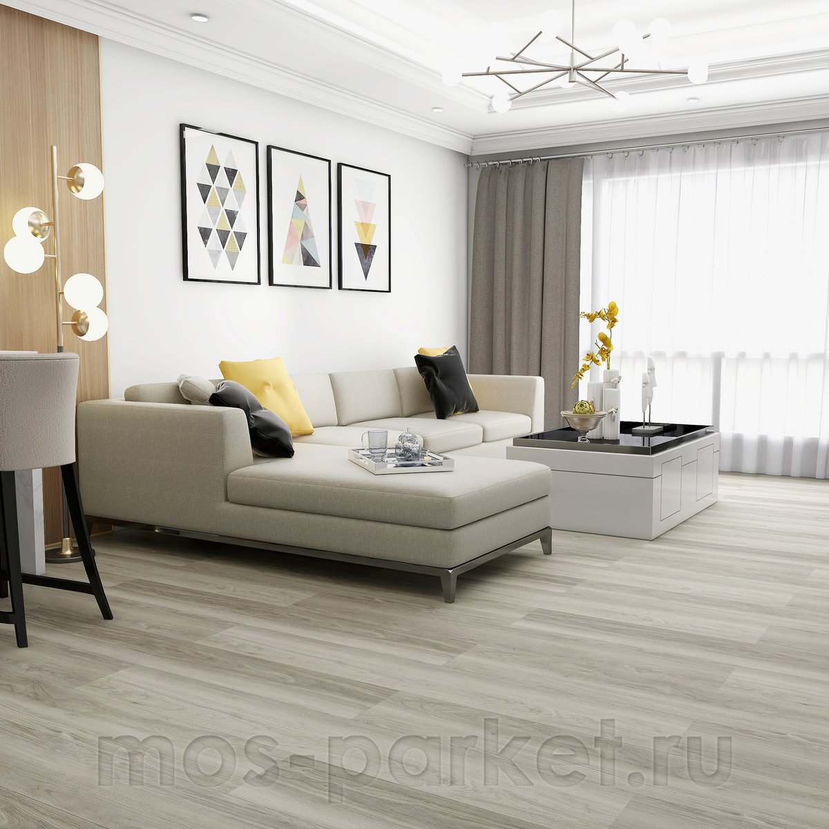 SPC ламинат Bronix Kvarr Rauh – это элегантный серый декор с холодным подтоном, который передает эстетику выбеленного и состаренного дуба. Цвет здесь явно уходит в серую гамму, но не монотонную – в нем присутствуют легкие дымчатые переходы и едва заметные бежевые нюансы, создающие живую игру оттенков. Текстура дерева читается отчетливо: крупные годовые кольца образуют красивые волны, древесные волокна прорисованы детально, а рельефная поверхность добавляет тактильной реалистичности. Крашеная фаска деликатно подчеркивает геометрию каждой планки, не нарушая общей воздушности покрытия.