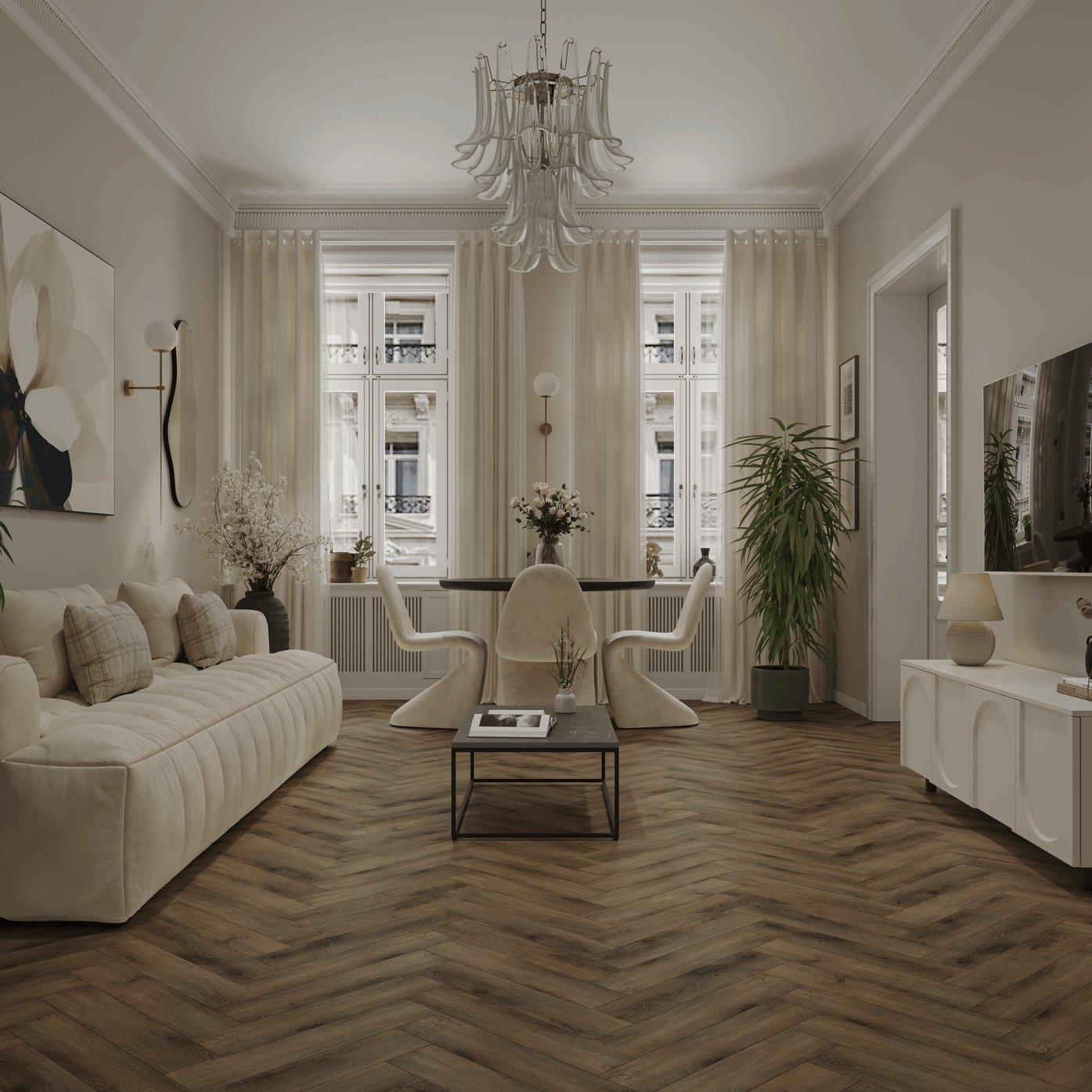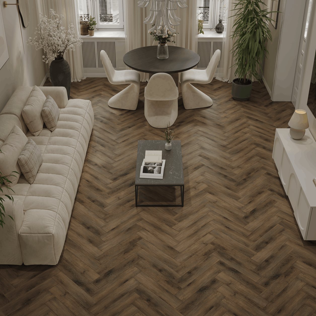 Влагостойкая виниловая ёлочка 43 класса Valland Parquet, от производителя Ensten, в декоре Мальта (Malta) тёмно-коричневого цвета с фаской по периметру и замком для плавающего способа укладки. Плашки толщиной 4 мм раскладываются под дизайн английской ёлочки. Напольное покрытие Valland Parquet, Мальта (ECO 103-20) продаётся упаковками по 26 планок размером 125×600 мм общей площадью 1.95 м². Предоставляется гарантия производителя Ensten.