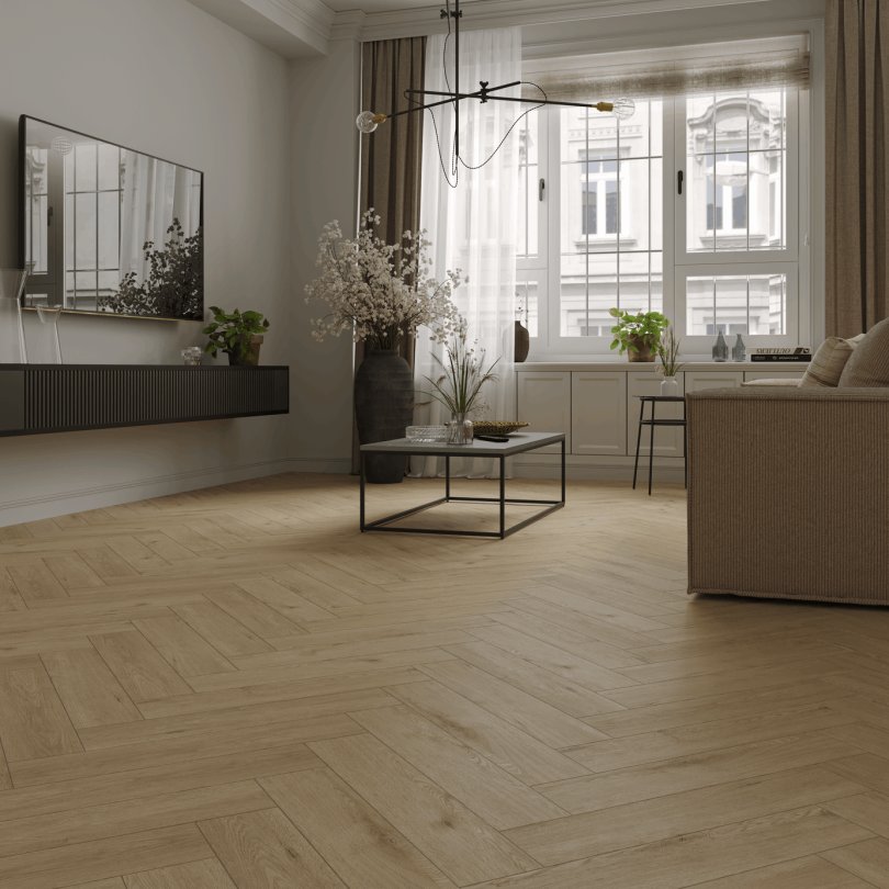 Каменный SPC паркет 34 класса Norland в формате английской ёлки 1066-6 Clear Room светло-коричневого цвета с фаской по периметру для плавающего и клеевого способа укладки, толщиной 4 мм от Российского производителя Norland. Дизайн выполнен под Английскую ёлку. Напольное покрытие Parquet Clear Room (1066-6) продаётся упаковками по 26 планок размером 125×600 мм общей площадью 1.95 м². Предоставляется гарантия производителя Norland в 25 лет.
