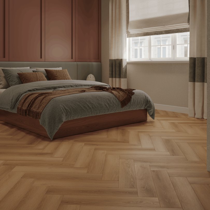 Каменный SPC паркет 34 класса Norland в формате английской ёлки 1055-7 Orel светло-коричневого цвета с фаской по периметру для плавающего и клеевого способа укладки, толщиной 4 мм от Российского производителя Norland. Дизайн выполнен под Английскую ёлку. Напольное покрытие Parquet S Orel (1055-7) продаётся упаковками по 26 планок размером 125×600 мм общей площадью 1.95 м². Предоставляется гарантия производителя Norland в 25 лет.