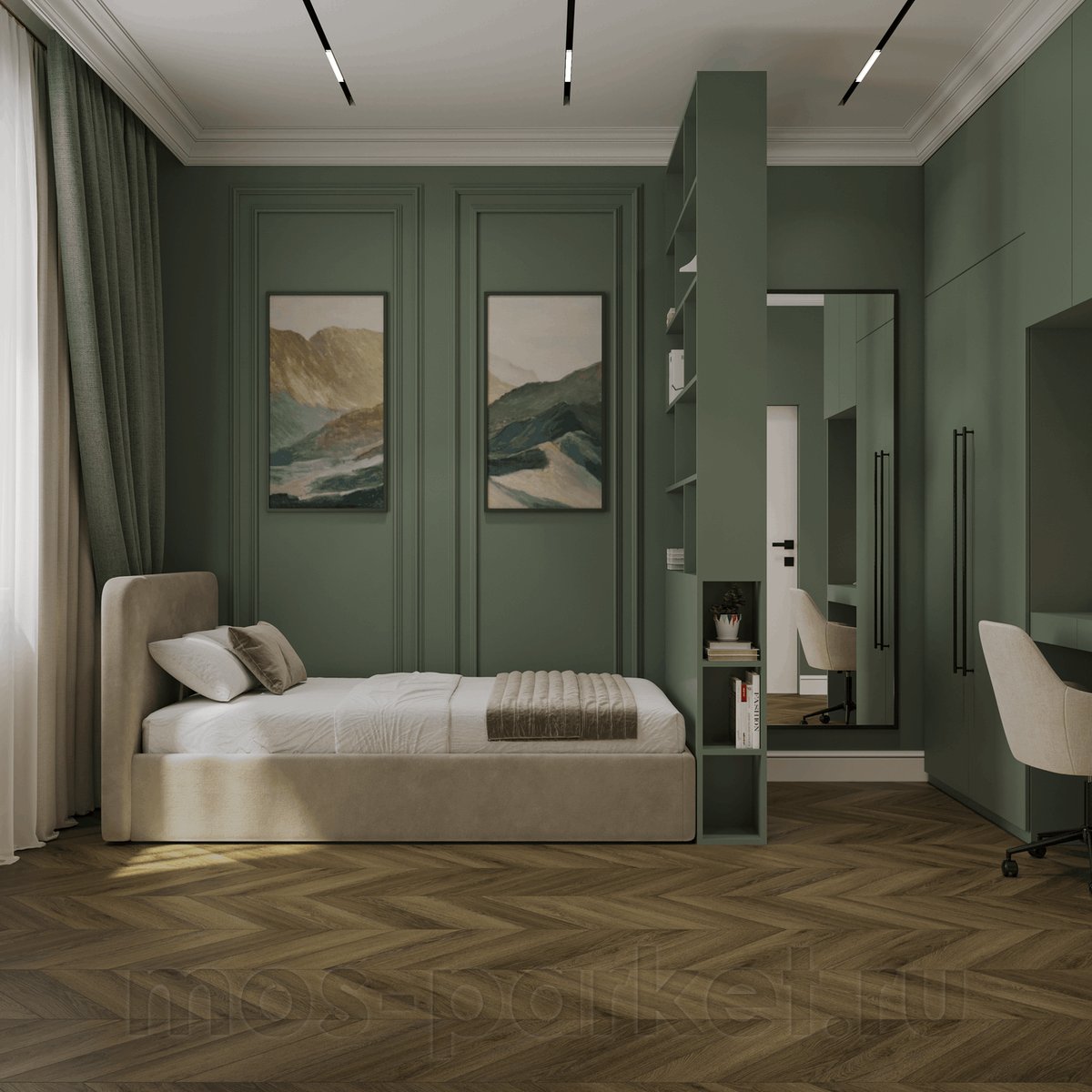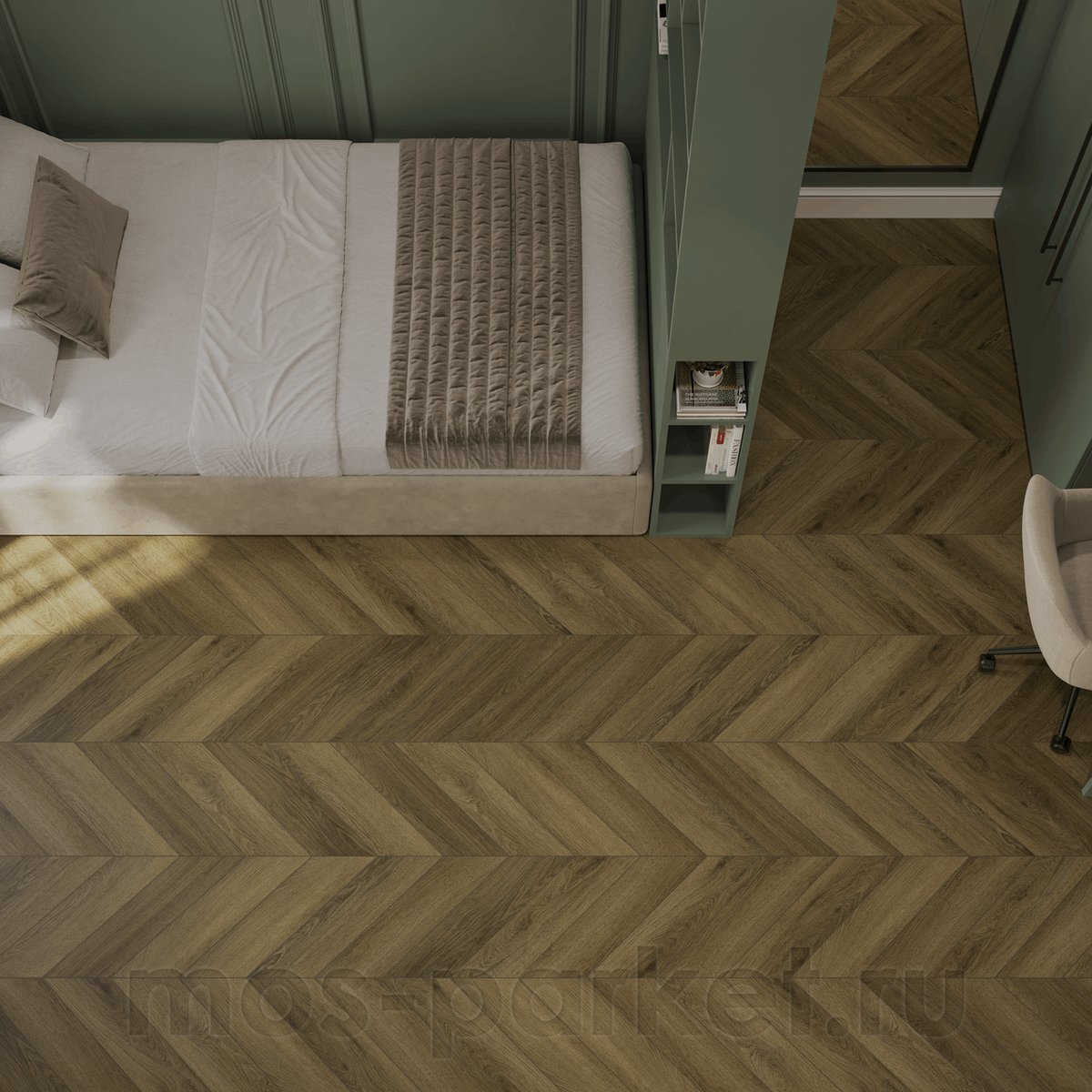 Tulesna Art Chevron 1011-11 Libero (Либеро - «свобода, лёгкость») - каменный SPC паркет в формате французской ёлочки с глубоким, спокойным древесным характером. Декор выполнен в тёмном натуральном оттенке с оливково-коричневой базой и выраженным рисунком древесных волокон, благодаря чему пол выглядит солидно и атмосферно. Крашенная фаска 4V-Groove подчёркивает геометрию каждой паркетины и делает шевронный узор более рельефным и выразительным.