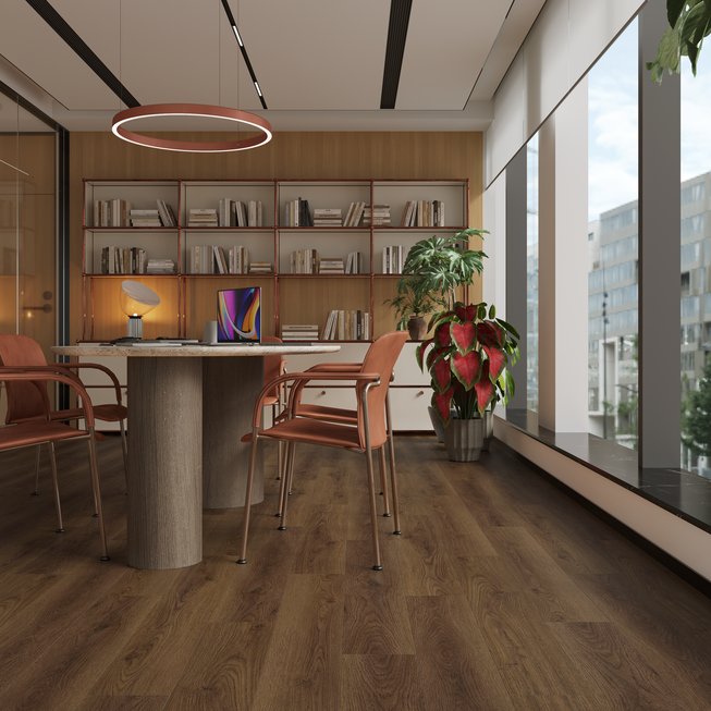 Замковый виниловый пол 34 класса Tulesna Hard 1044-6 Atlant коричневого цвета. Однополосные планки толщиной 5 мм снабжены фаской 4V Groove и покрыты защитным слоем Easy Clean - 0,5 мм. Напольное покрытие Hard Atlant продаётся упаковками по 8 планок размером 183×1220 мм общей площадью 1,786 м². Предоставляется гарантия производителя Tulesna в 25 лет.
