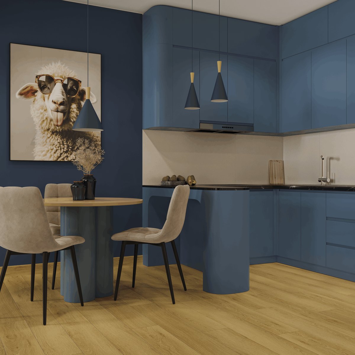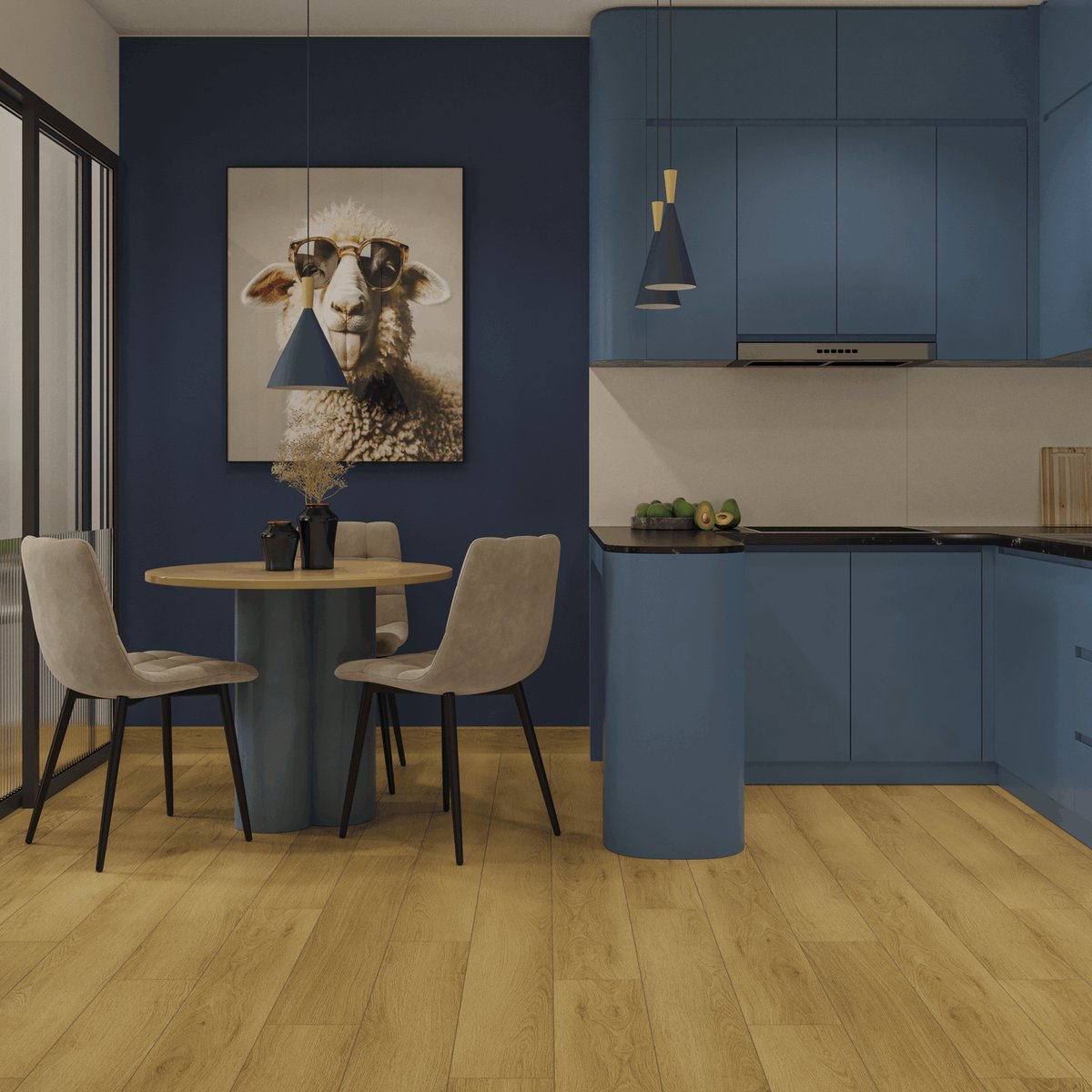 Клеевой виниловый пол 43 класса Tulesna Ottimo LVT Leggero светло-коричневого цвета. Однополосные планки 1219.2х184.15 мм, толщиной 2.5 мм снабжены фаской 4V Groove и покрыты защитным слоем Easy Clean - 0,5 мм.