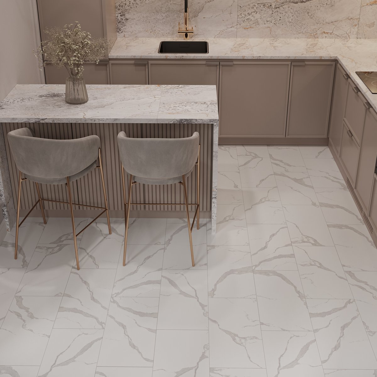 Матовая текстура придаёт покрытию современный и дорогой вид. Декор особенно гармонично смотрится в интерьерах в стиле минимализм, неоклассика, modern и contemporary. Он отлично сочетается с латунной или чёрной фурнитурой, стеклянными перегородками, светлой мебелью, натуральным деревом и спокойной нейтральной палитрой стен.