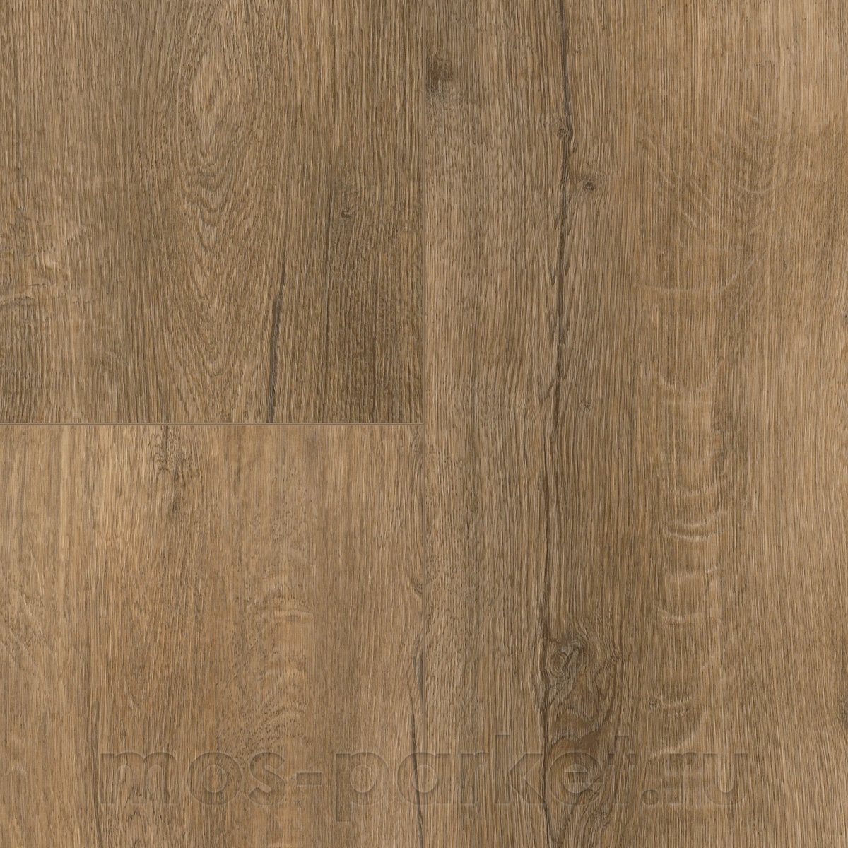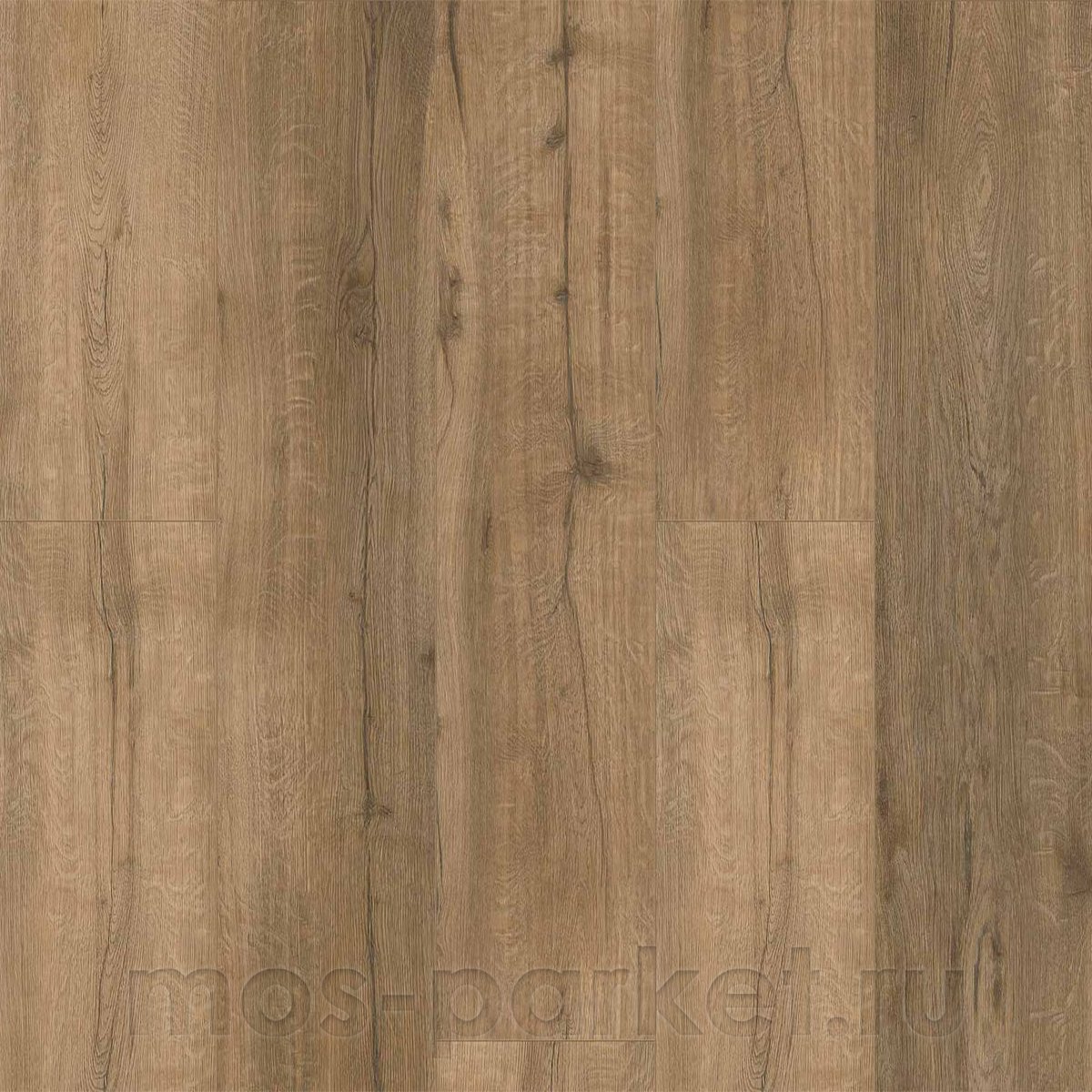 Цветовая палитра декора сочетает в себе ореховые и карамельные тона с более тёмными, почти угольными прожилками и сучками. Рисунок древесины выглядит естественно состаренным, с имитацией мелких трещинок и потёртостей, что придаёт ему глубину и выразительность. Технология синхронного тиснения Registered Embossed идеально повторяет рельефом каждую деталь узора, создавая тактильное ощущение настоящего винтажного дерева. Четырёхсторонняя фаска 4V подчёркивает геометрию досок и усиливает эффект массивного пола.