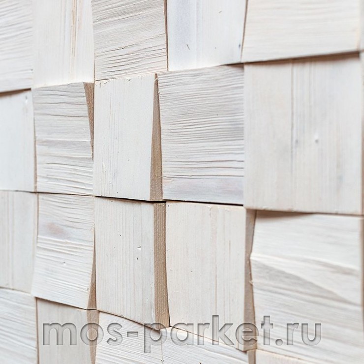 Декоративная мозаика для стен WP3D1321 Эста Белая от Российского производителя Crownwood из брашированного массива колотой сосны покрытой восковой лазурью белого цвета. Дизайн выполнен в форме 3D квадратов 90×90 мм каждый. Сборная панель размером 360×360 мм соединяется с помощью системы Шип-Паз и занимает толщину 6-16 мм. Настенная мозаика Esta White изготавливается только под заказ и поставляется упаковками по несколько модулей общей площадью 1,94 м². В 1 кв.м. входит ± 8 модулей. Гарантия на продукцию до 30 лет.
